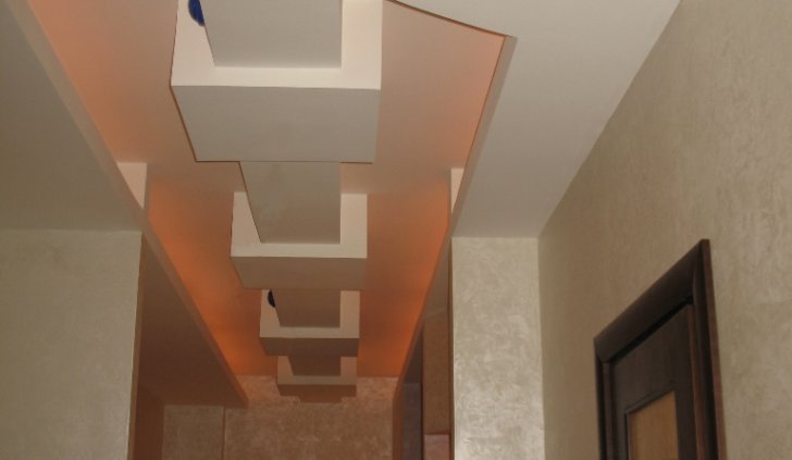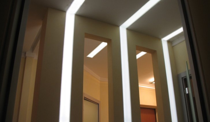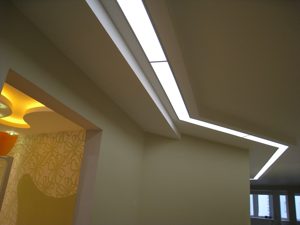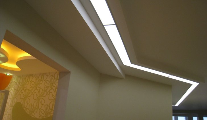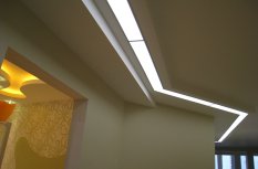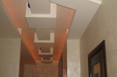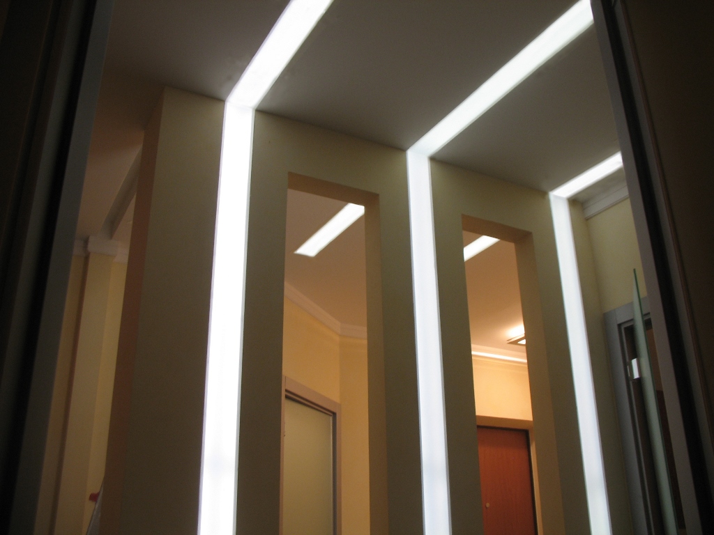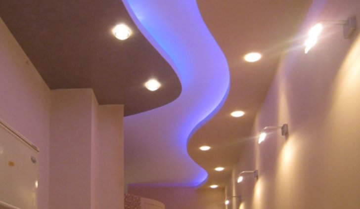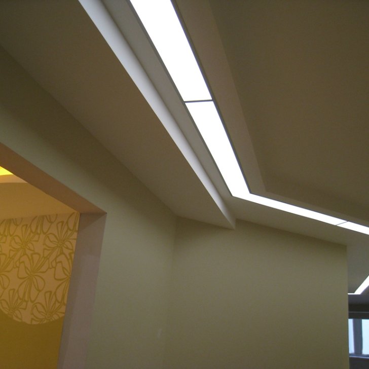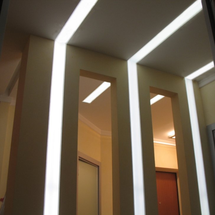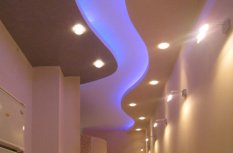 Один из самых распространённых способов реализации светодиодной подсветки - подсветка потолочного карниза из гипсокартона. В зависимости от цвета светодиодной ленты и её яркости, она может служить для основного освещения коридора или декоративной подсветки. Такая подсветка нередко комбинируется с точечными светильниками, в этом случае они служат источником основного света, а светодиодная лента - фонового или декоративного. Для такой подсветки нередко используется многоцветная светодиодная лента RGB, которая, при использовании вместе с RGB контроллером, позволяет получить тысячи разных цветов и оттенков.