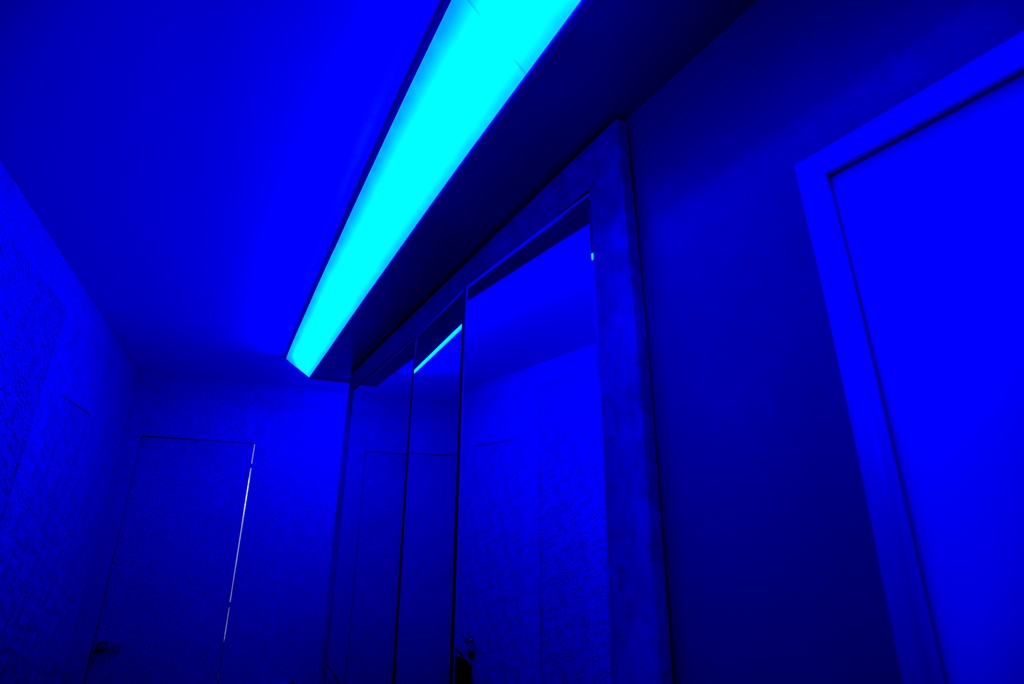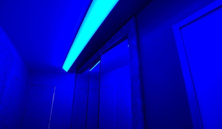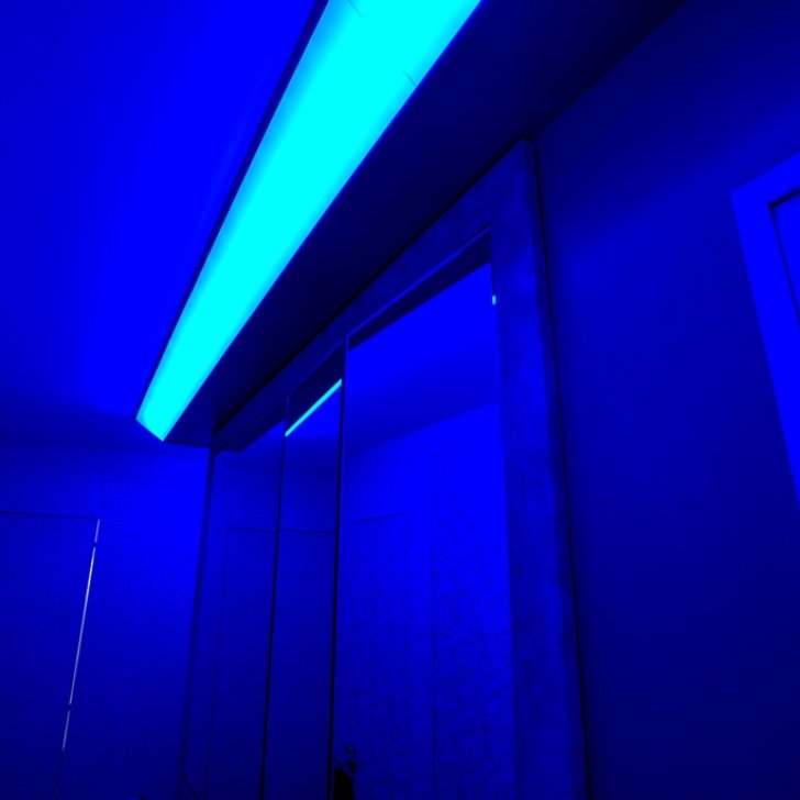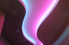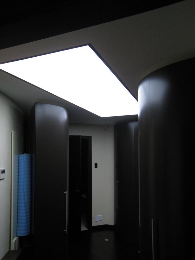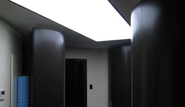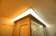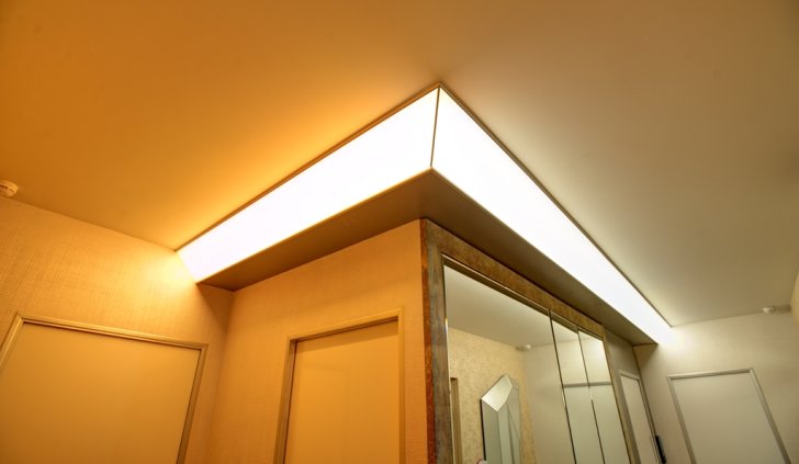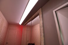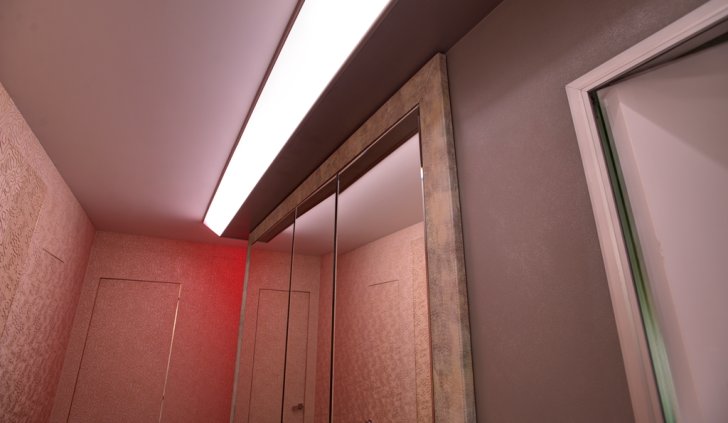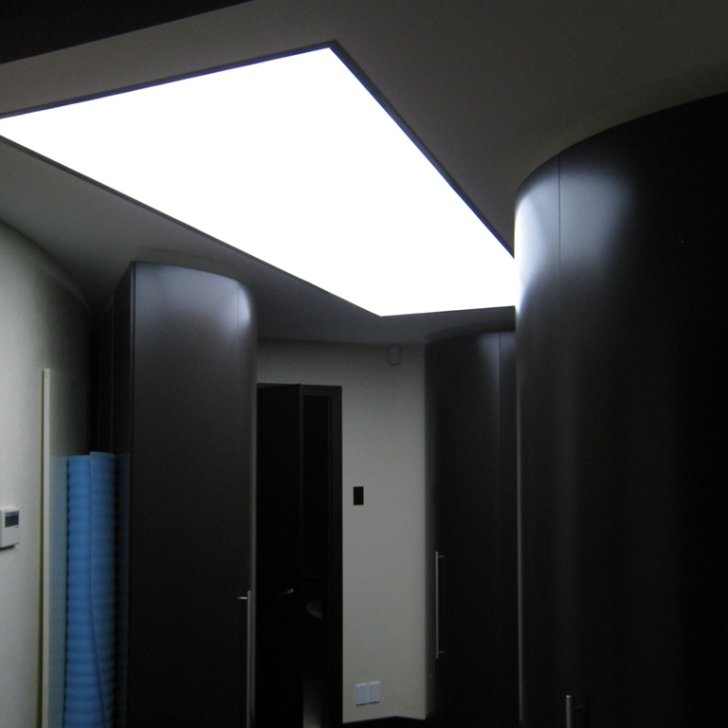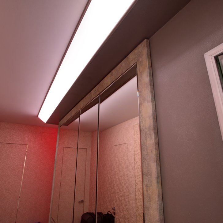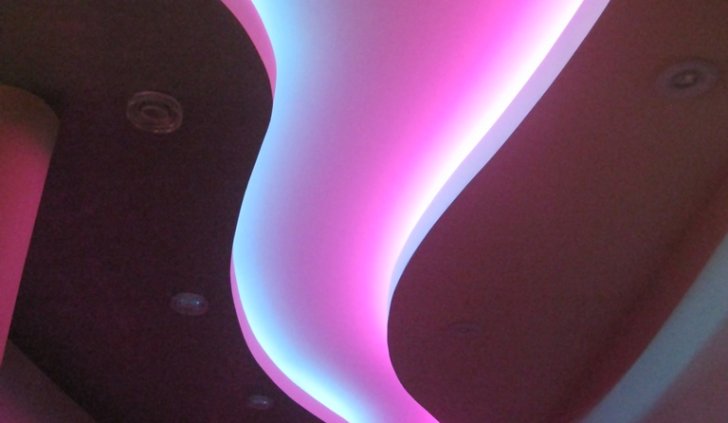 Менее распространённый ввиду большей сложности установки, но эффектный способ освещения - светящийся потолок. Для этого используется яркая светодиодная лента и светопрозрачный натяжной потолок либо матовое оргстекло белого цвета.
