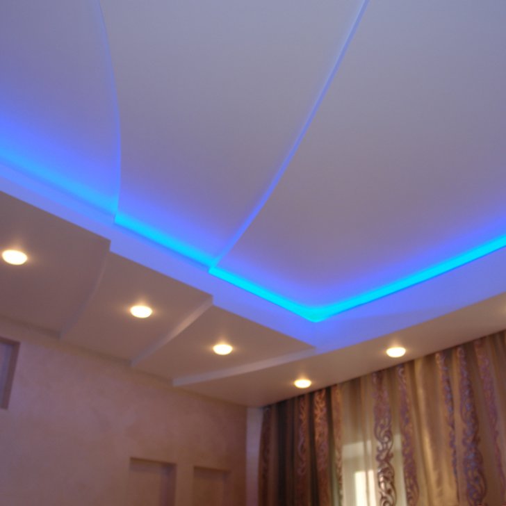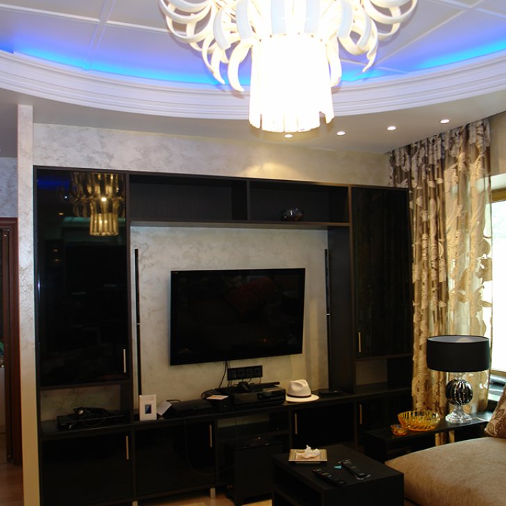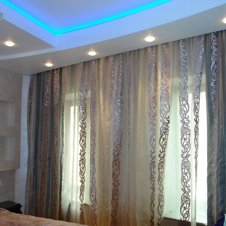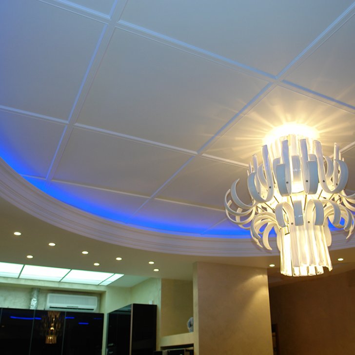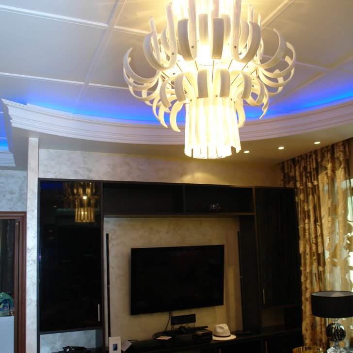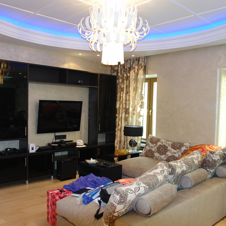Периметр гостиной украсил карниз с лепным декором. Синяя светодиодная лента Arlight подчеркнула его формы и красоту лепнины. В подсветке спальной комнаты использовали такую же ленту.