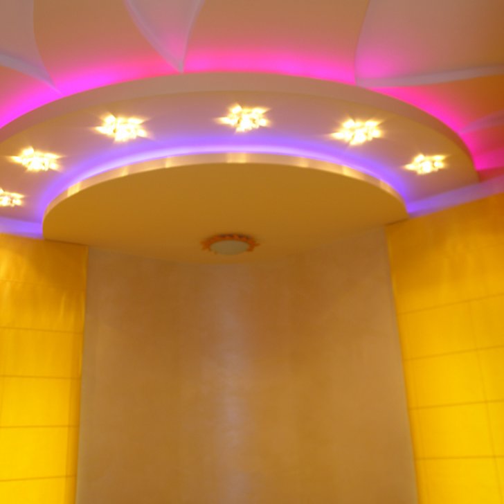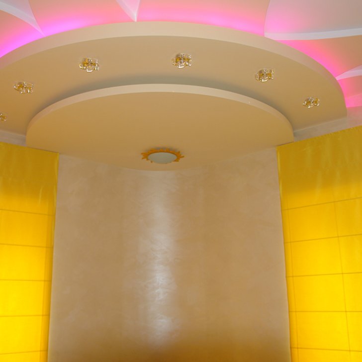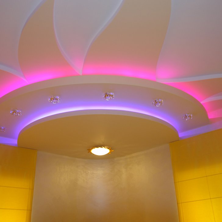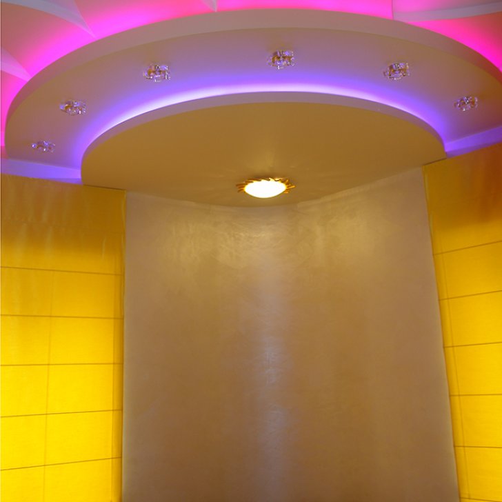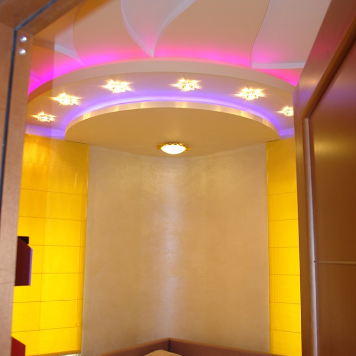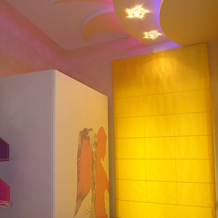Но самым интересным объектом стало "солнце" в детской комнате. Оно находится на потолке и состоит из нескольких уровней, которые подсвечиваются многоцветными светодиодными лентами. При помощи многозонного пульта и RGB контроллеров Arlight, управлять зонами подсветки можно не зависимо друг от друга.