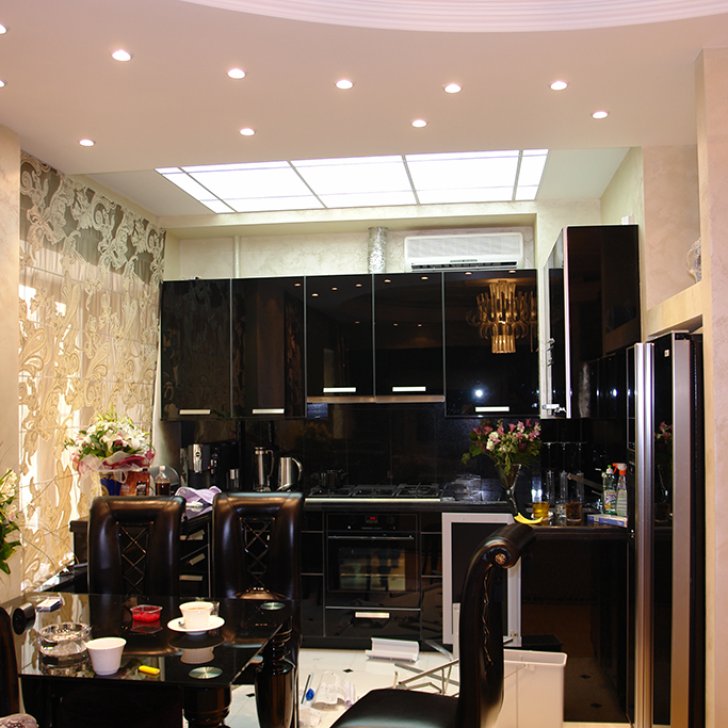 Основным источником освещения на кухне является светящийся потолок. Для этого на потолок с определёнными промежутками была установлена светодиодная лента, которая затем скрылась светопропускающим оргстеклом.