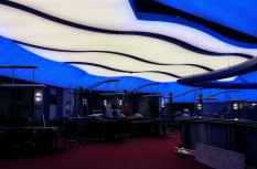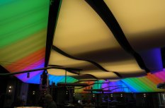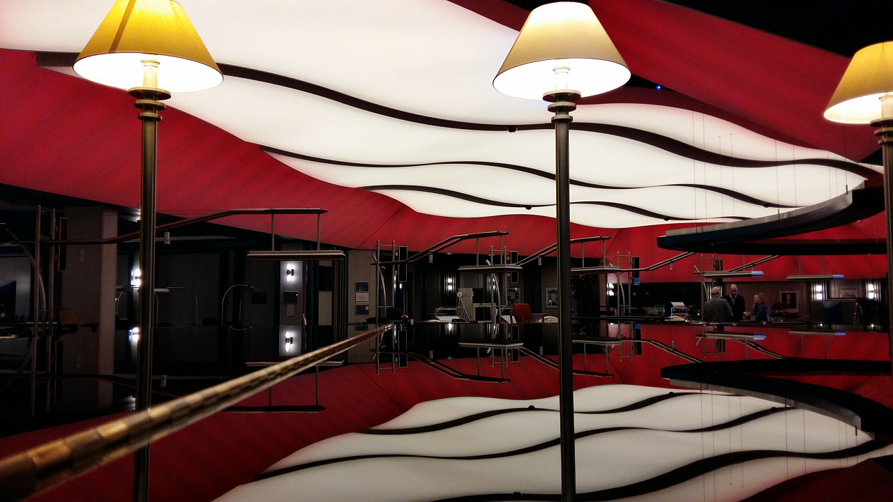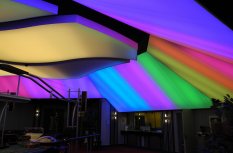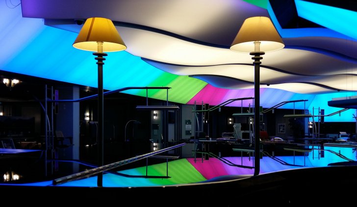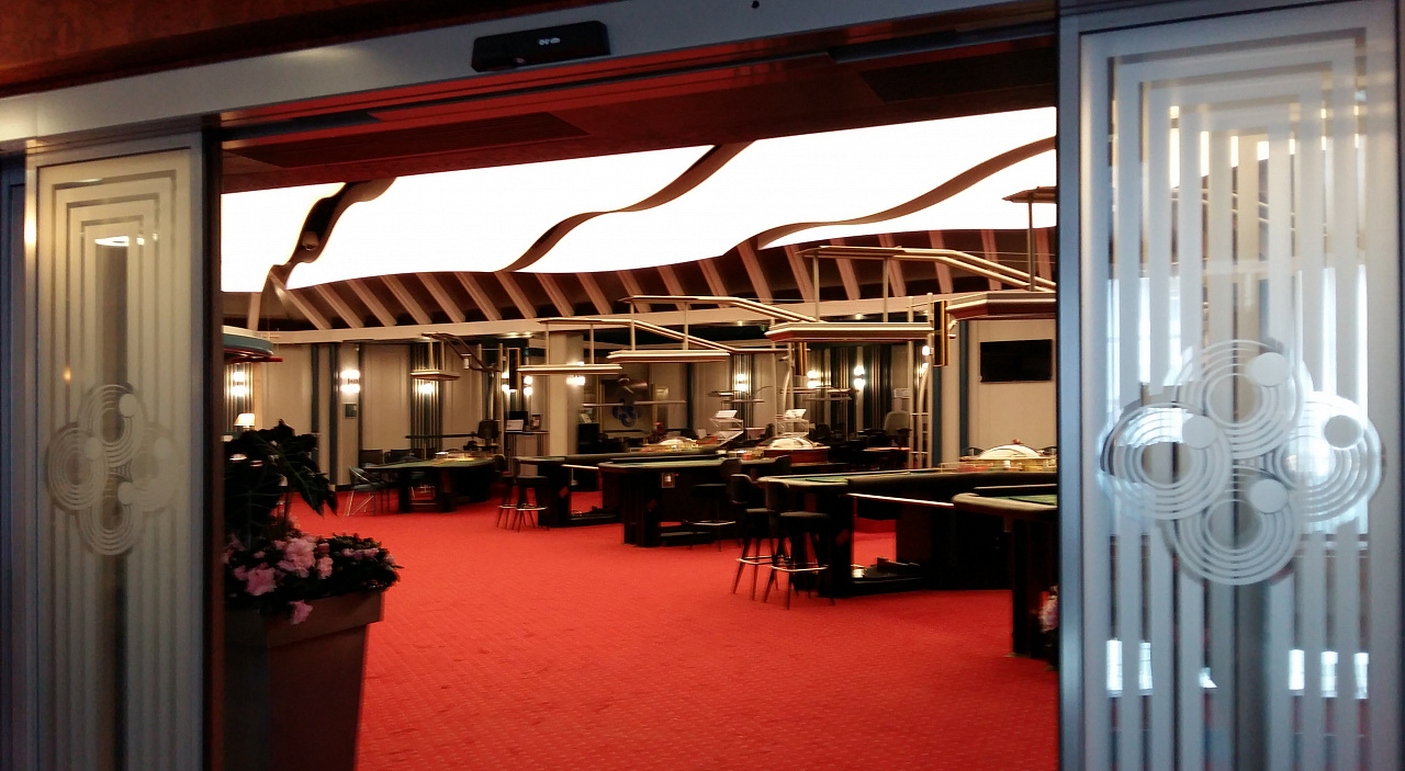 Для придания праздничной атмосферы в игровом зале по его периметру монтированы ленты RGB, которые позволяют создавать самые разные светодинамические сценарии. Управление происходит по стандарту DMХ с помощью четырехканального декодера и настенной панели дистанционного управления. Динамика света и цвета, отраженная в многочисленных глянцевых поверхностях, наполняет пространство и поддерживает игровое настроение гостей казино.