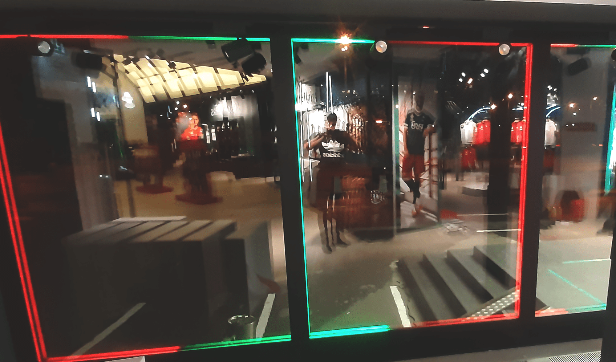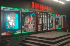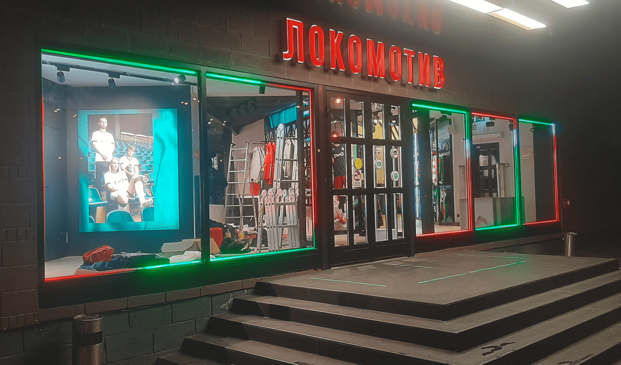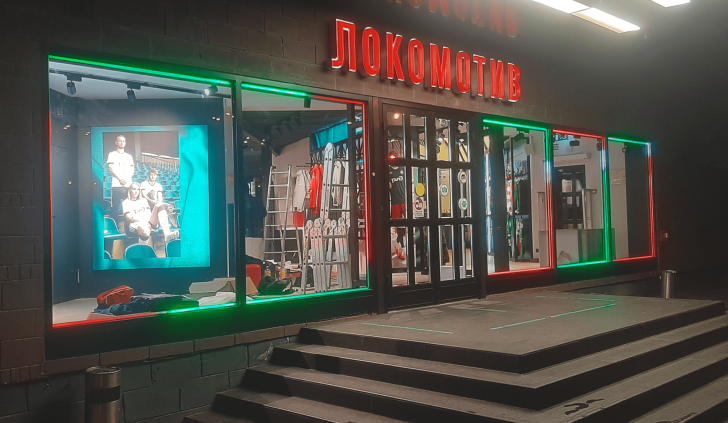 Витрина магазина ФК «Локомотив» оформлена в цвете клуба: яркая динамическая красно-зеленая подсветка. Мультицветные световые эффекты стали возможны с использованием лент «Бегущий огонь» и контроллера для управления.