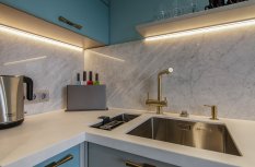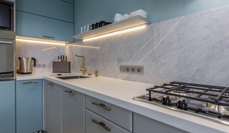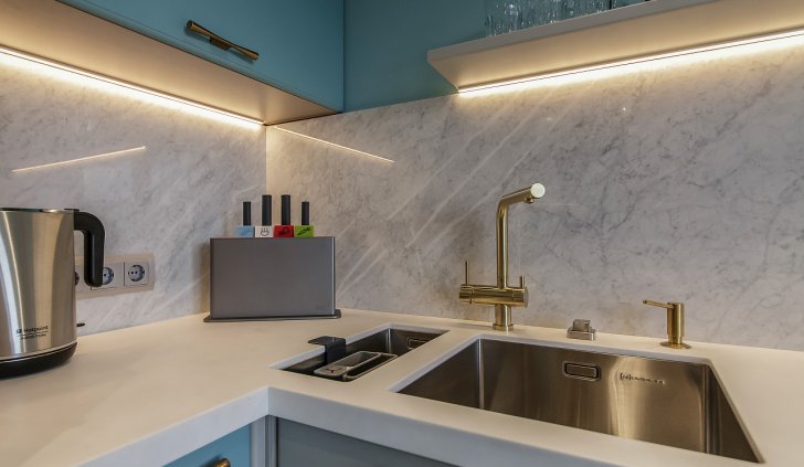 Рабочее освещение на кухне реализовано с помощью яркой светодиодной ленты, оформленной в плоский алюминиевый профиль и матовый экран. Для проекта была выбрана светодиодная лента с высоким CRI больше 85% и тёплым белым светом. Она прекрасно подходит для обеспечения достаточного освещения рабочей зоны.
