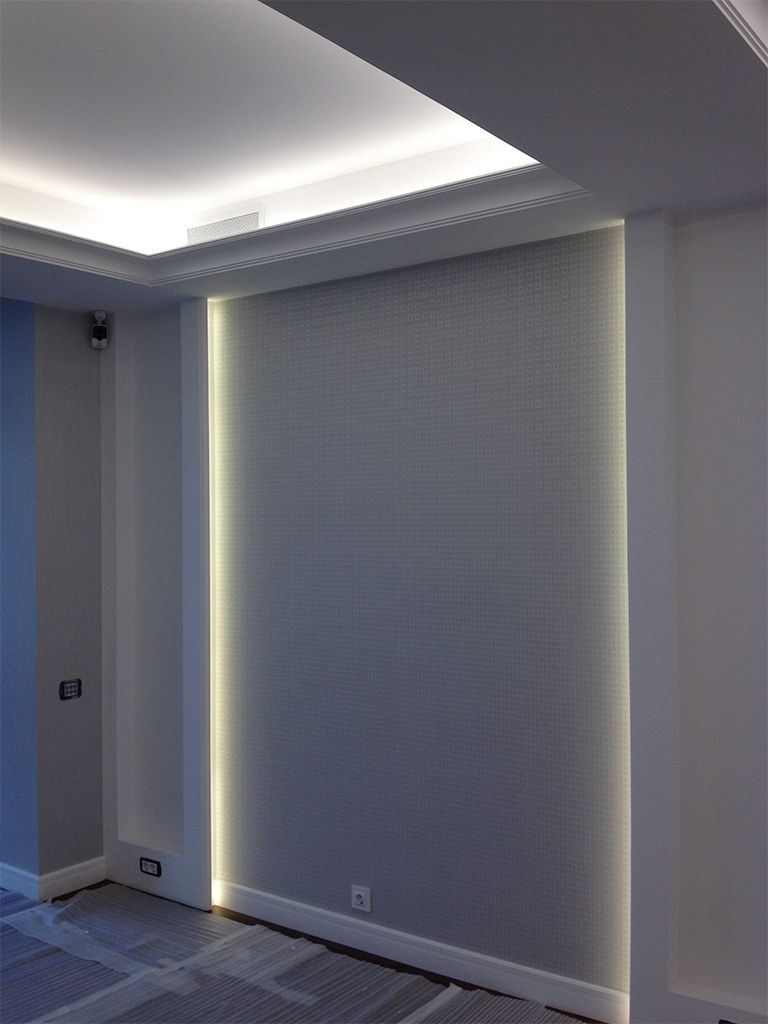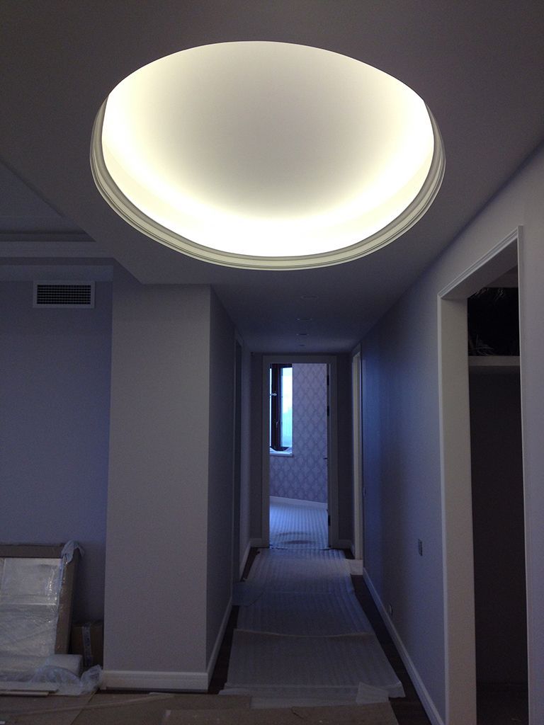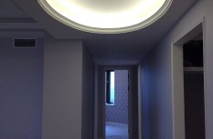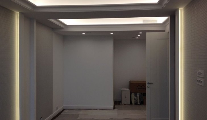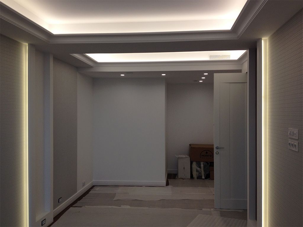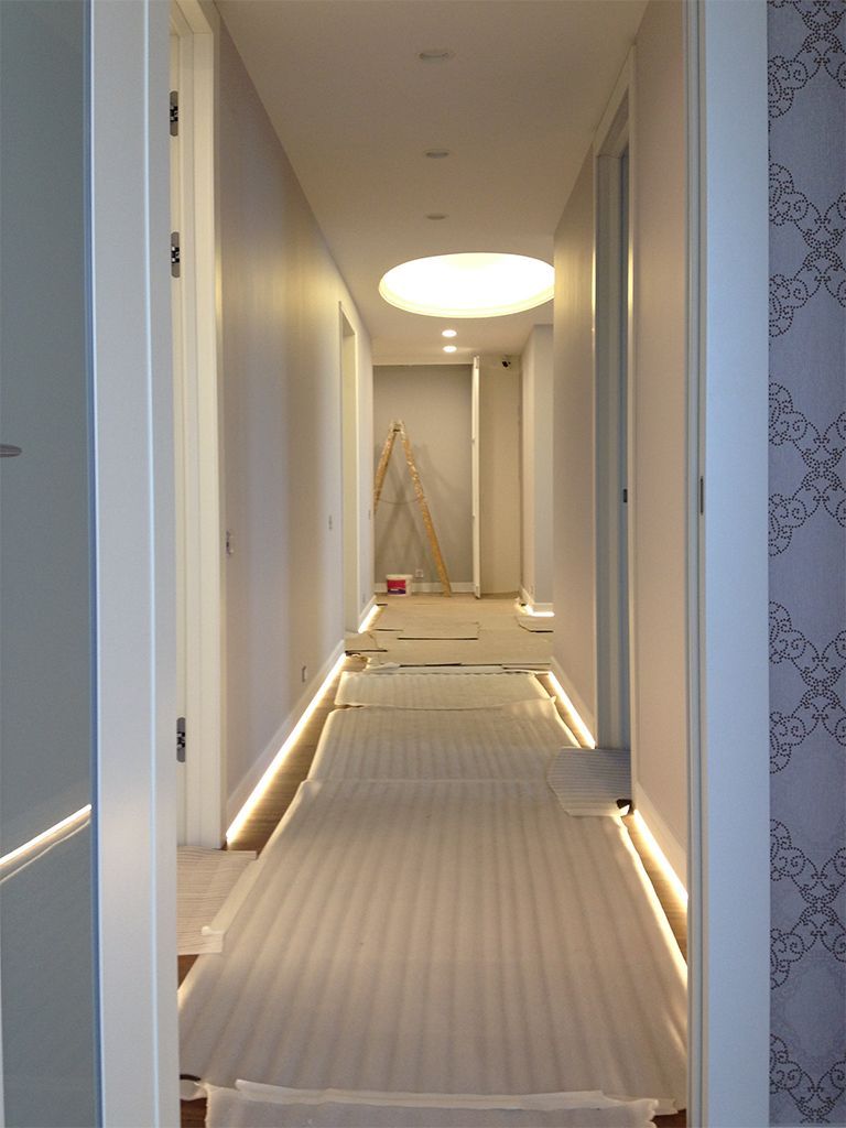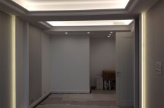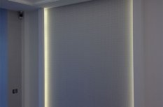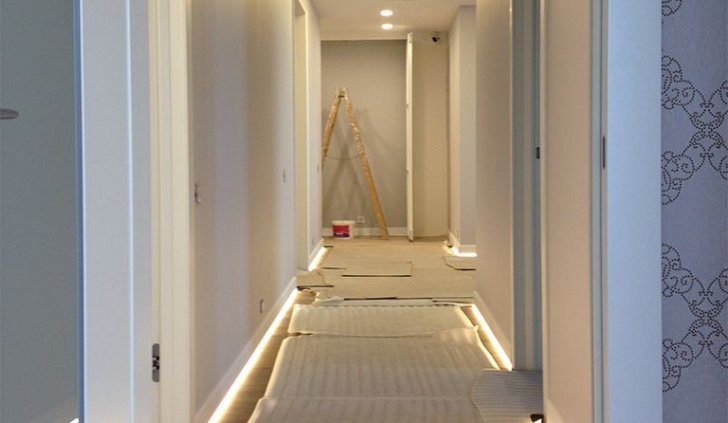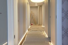 Во входной зоне и коридоре роль основного освещения выполняют встроенные светодиодные светильники Arlight, сочетающие в себе надёжность, экономичность и высокие качественные характеристики. Также дополнительная подсветка установлена вдоль плинтусов.