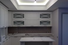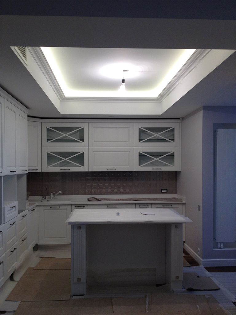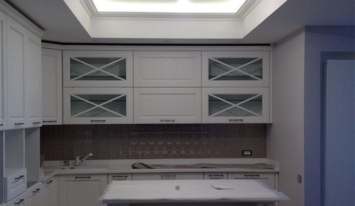 На кухне светодиодная подсветка используется для освещения рабочей поверхности. Кроме того, лента установлена в нижней части столешницы для декоративного освещения фасадов кухни.
