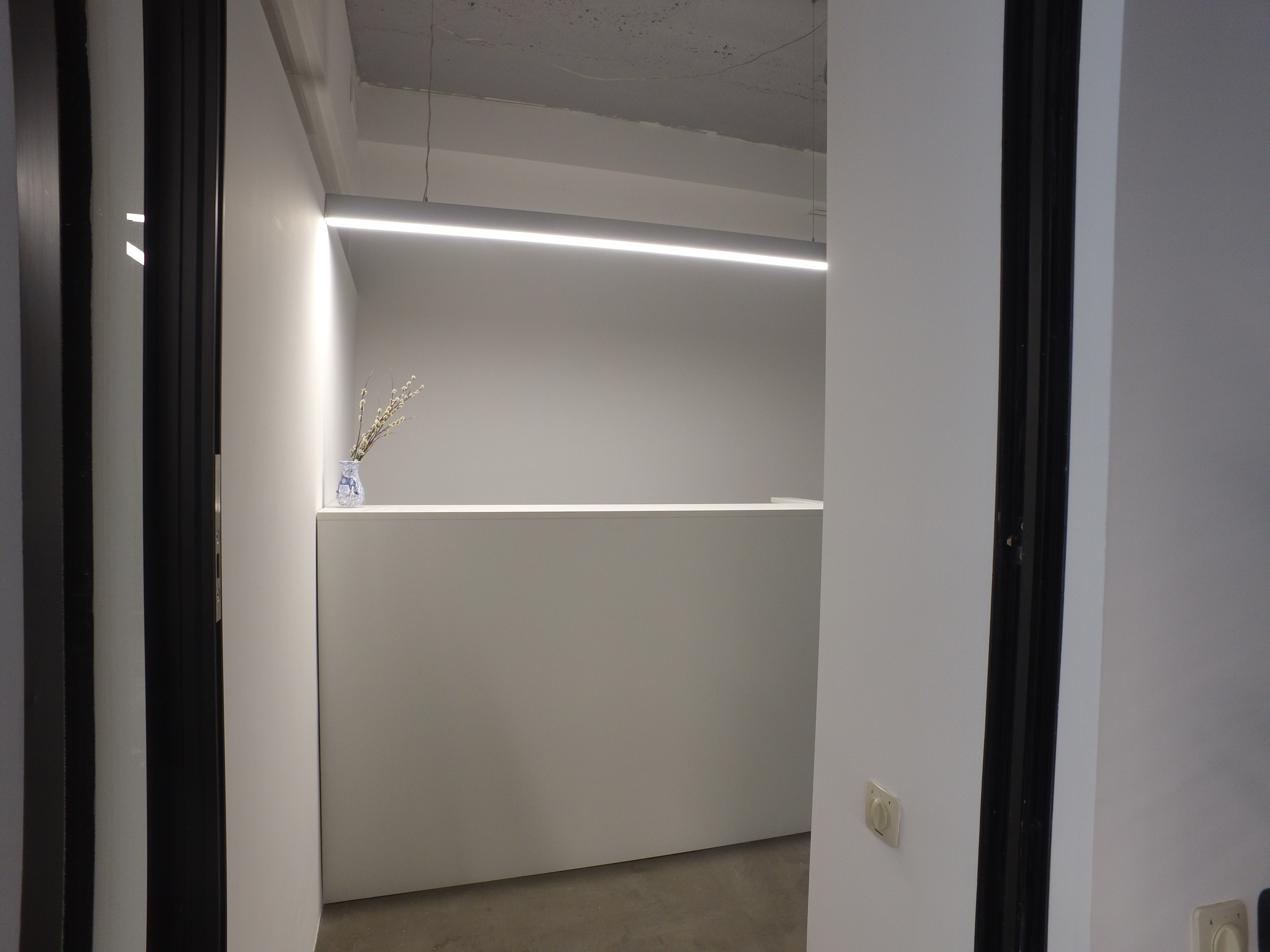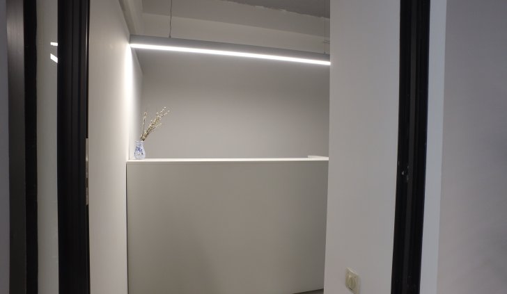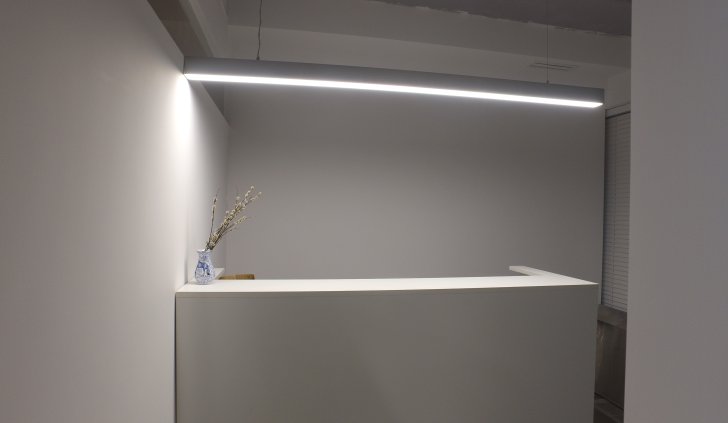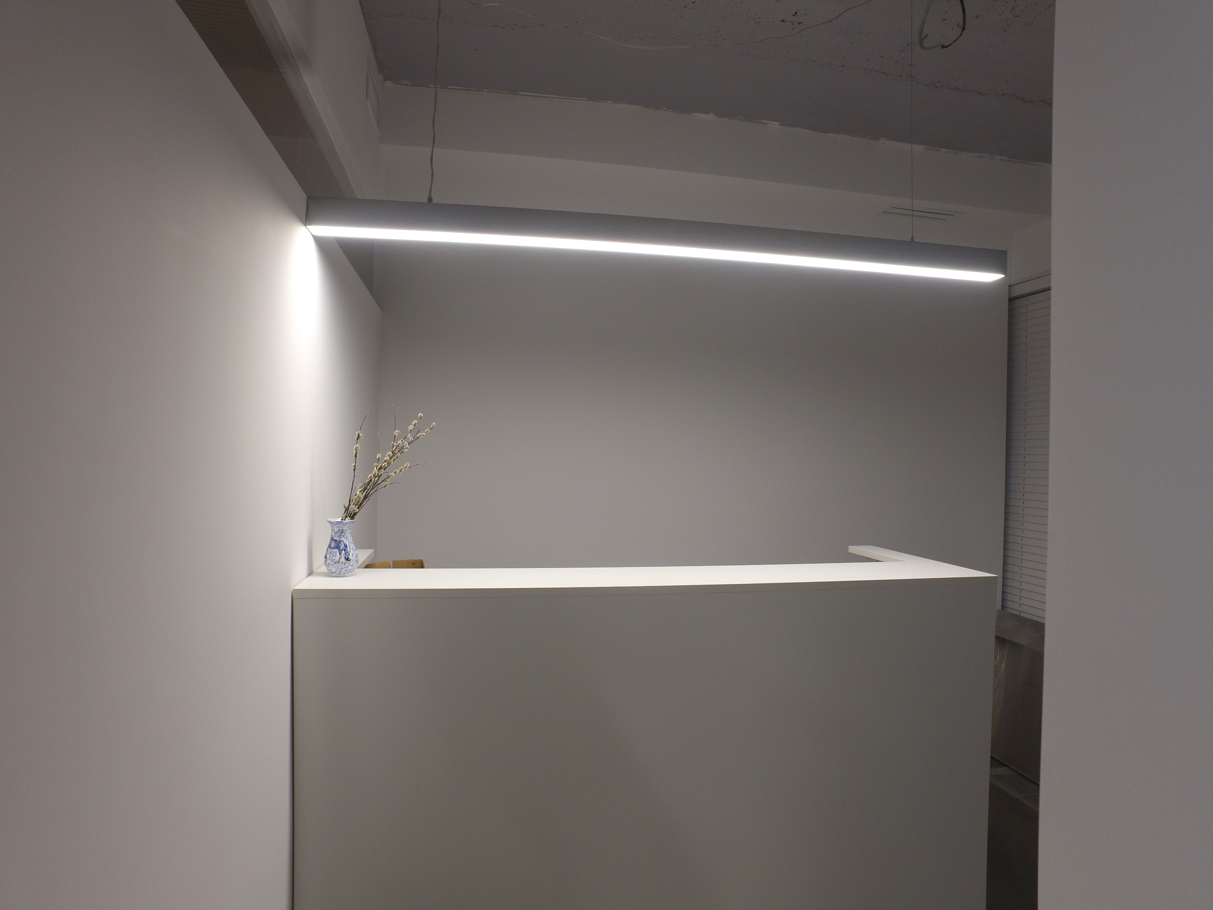 Зона ресепшена также освещена линейным подвесным светильником из алюминиевого профиля.