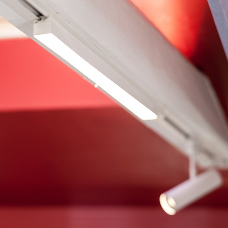 Для основного освещения было применено интересное решение: в деревянные потолочные балки были встроены треки (шинные профили) для светильников. На них установлены светодиодные трековые светильники и линейные светодиодные светильники. Линейные светильники были собраны из алюминиевого профиля, в который установлена светодиодная лента Arlight тёплого белого цвета свечения и блок питания для неё.