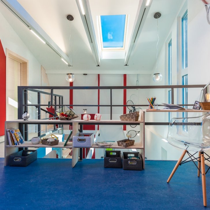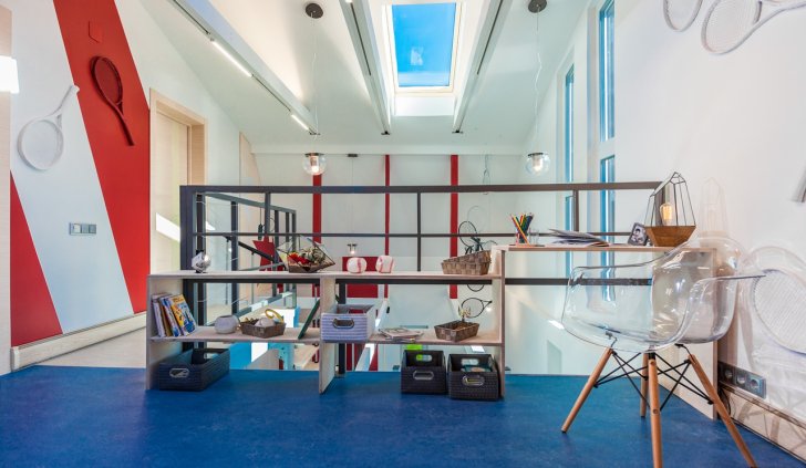 Объектом переделки стали две комнаты в загородном доме, расположенные друг над другом. Часть перекрытий была убрана, в крыше появилось множество больших окон. Объединённое помещение стало просторным, воздушным и светлым. Светлым и днём, и в тёмное время суток благодаря светодиодным светильникам разных типов.