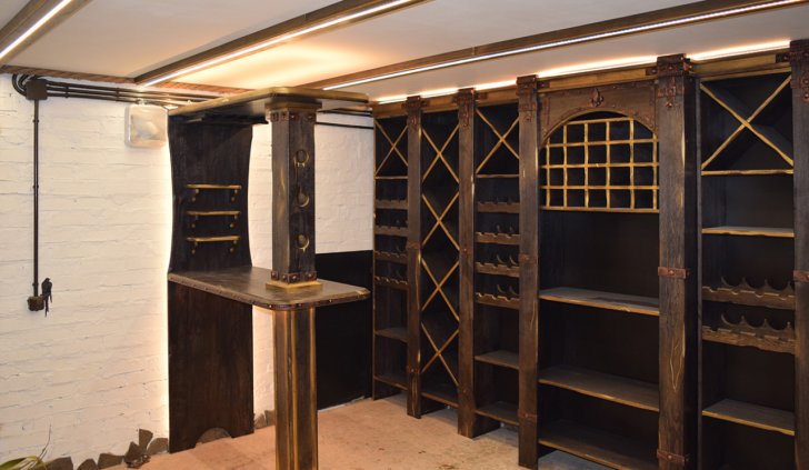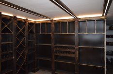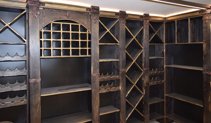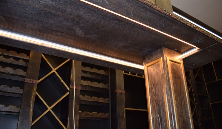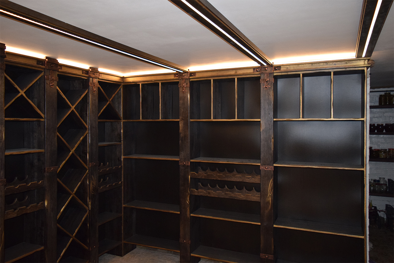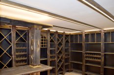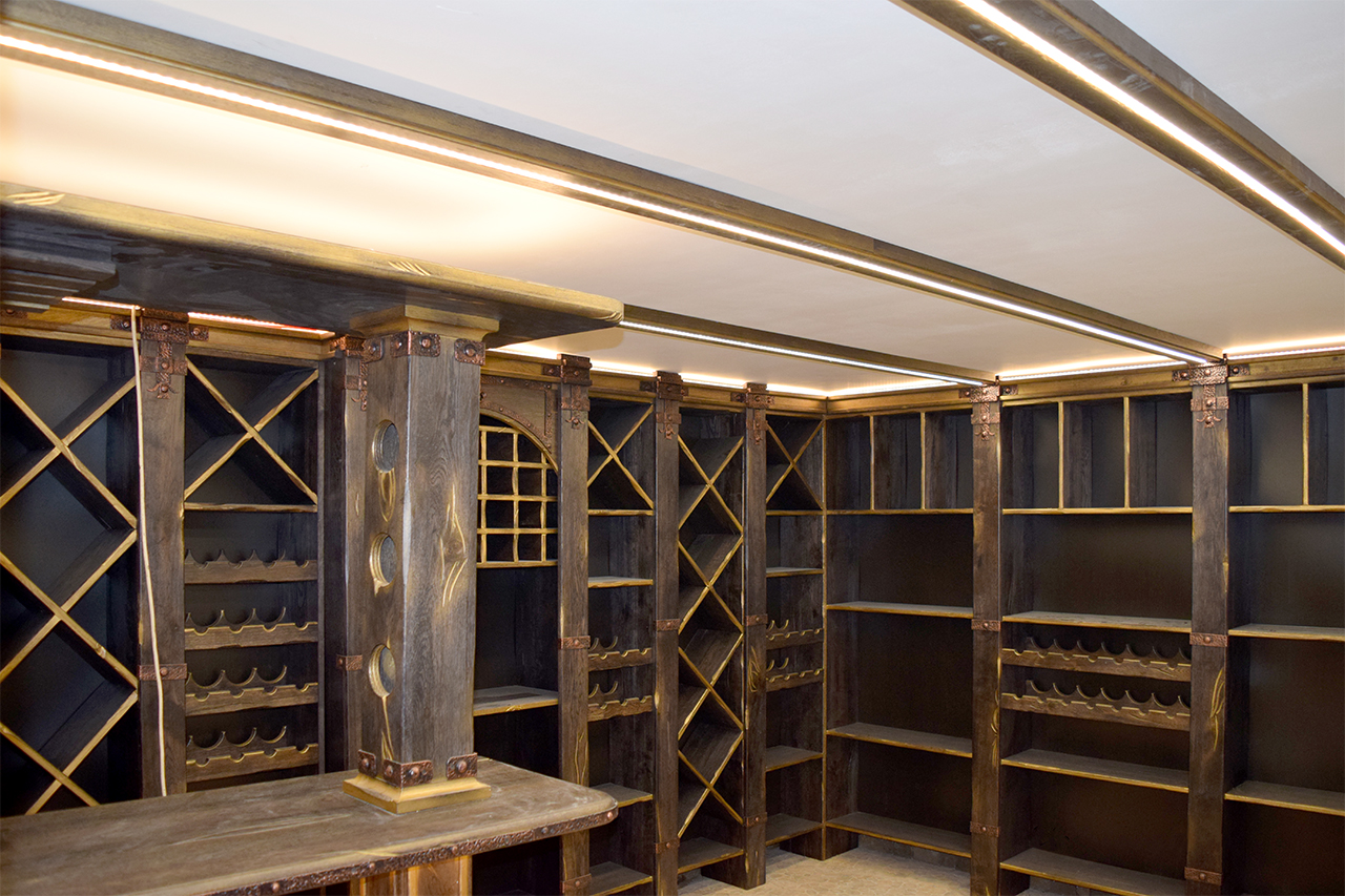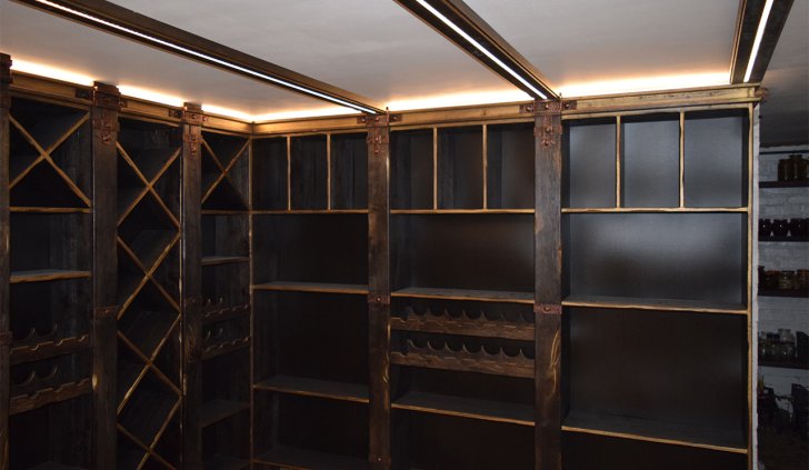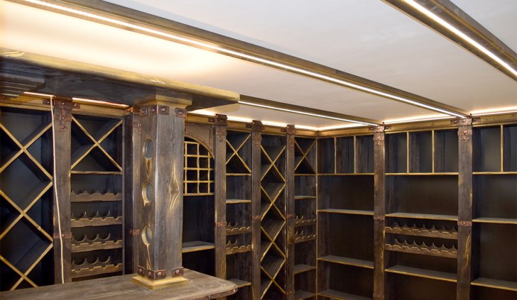 В частном винном погребе большую часть стен занимают специально оборудованные для хранения алкогольных напитков шкафы. Они спроектированы так, что между шкафами и потолком помещения остаётся небольшой зазор, прекрасно подходящий для светодиодной подсветки. Тем более, что дизайн шкафов подразумевает наличие декоративного карниза, который обеспечивает гармоничный переход от мебели к потолку.
