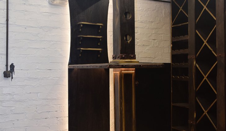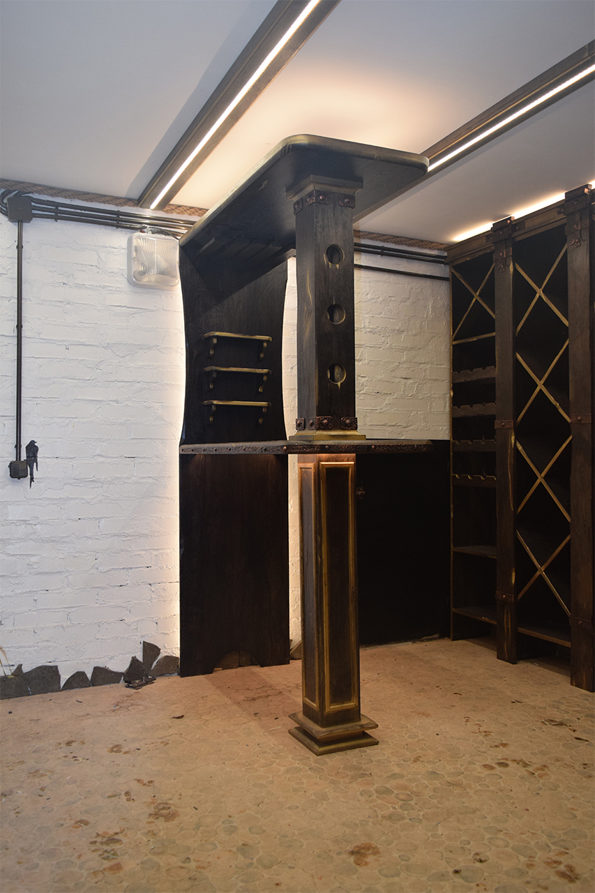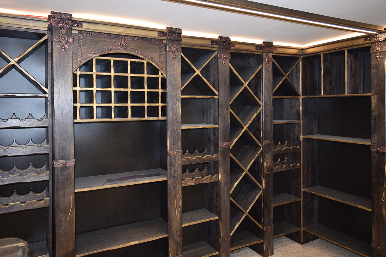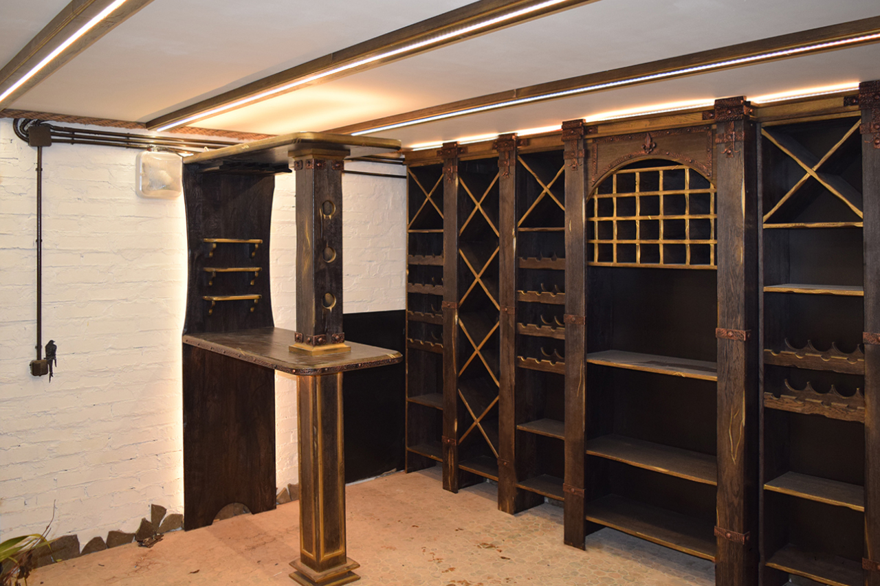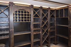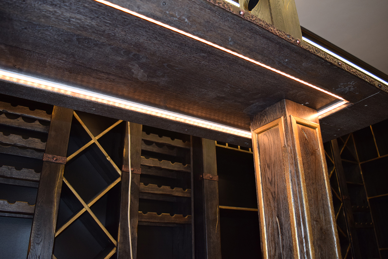 В частном винном погребе большую часть стен занимают специально оборудованные для хранения алкогольных напитков шкафы. Они спроектированы так, что между шкафами и потолком помещения остаётся небольшой зазор, прекрасно подходящий для светодиодной подсветки. Тем более, что дизайн шкафов подразумевает наличие декоративного карниза, который обеспечивает гармоничный переход от мебели к потолку.