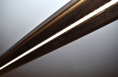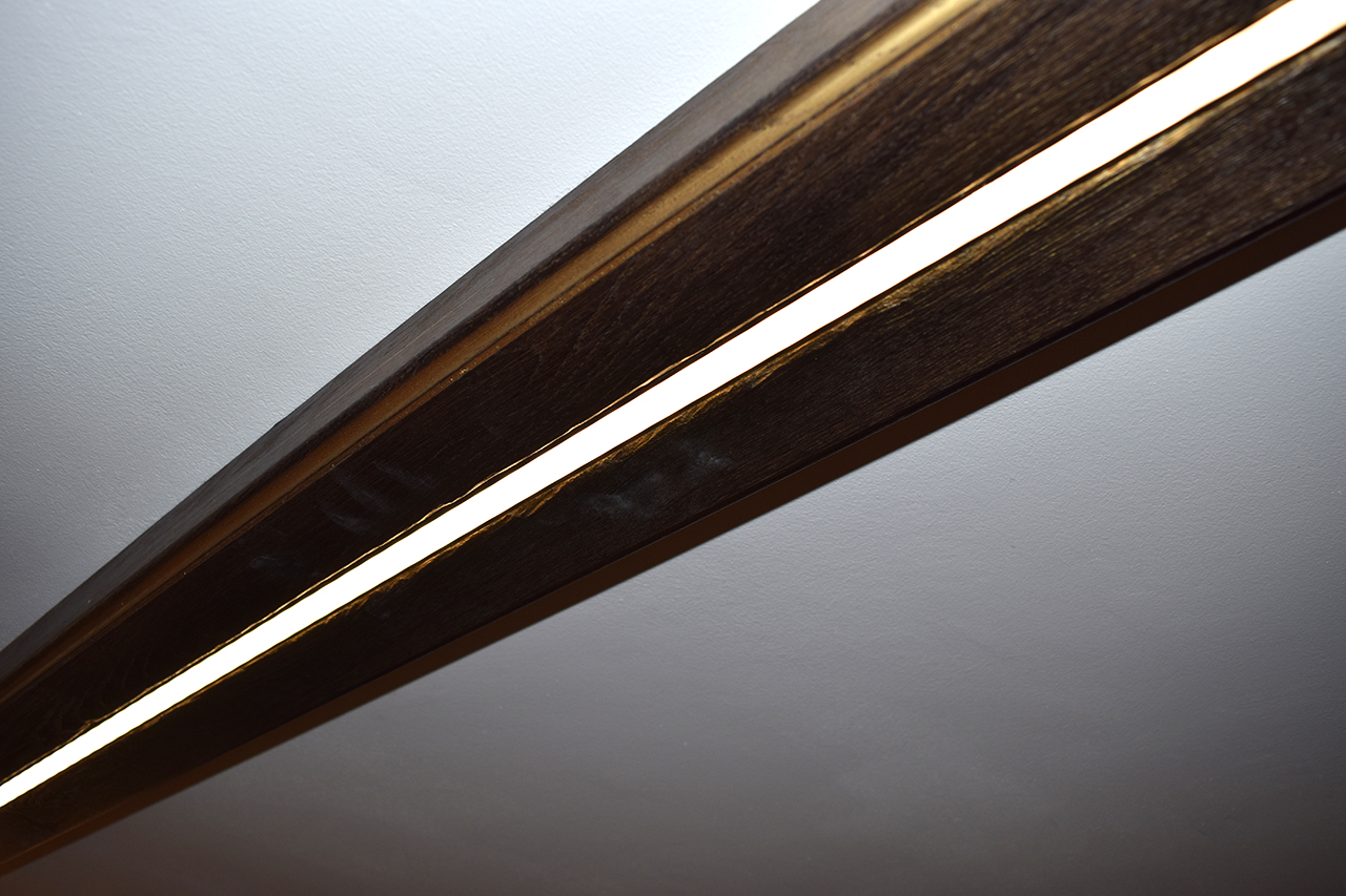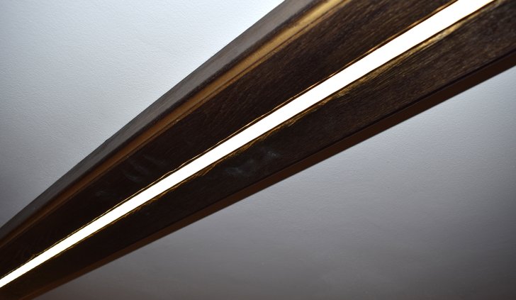 Также в погребе используется ещё один вид освещения – это линии света, вмонтированные в декоративные балки и зону опущенного деревянного потолка. Тонкие, оформленные с помощью алюминиевого профиля и матового экрана, светящиеся линии визуально облегчают балки и вносят в пространство гармоничные нотки современного стиля.