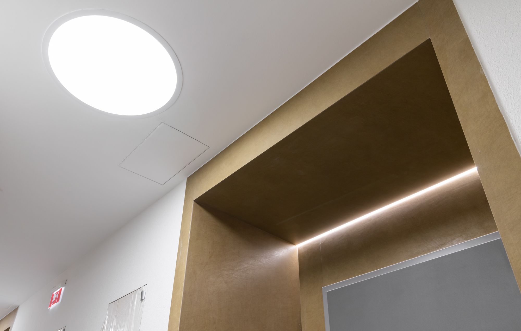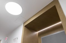 В рамках общей концепции освещения используются разнообразные световые приемы, которые гармонично сочетаются. Дизайнерские светильники из дугового профиля ARC предоставляют стильный свет с высоким индексом цветопередачи. Встроенные линейные светильники с теплым белым и дневным свечением обеспечивают идеальное основное освещение без слепящего эффекта. Настенные светильники с двойным светораспределением, направленные вверх и вниз, являются не только интересным декоративным элементом, но и функциональным источником света.