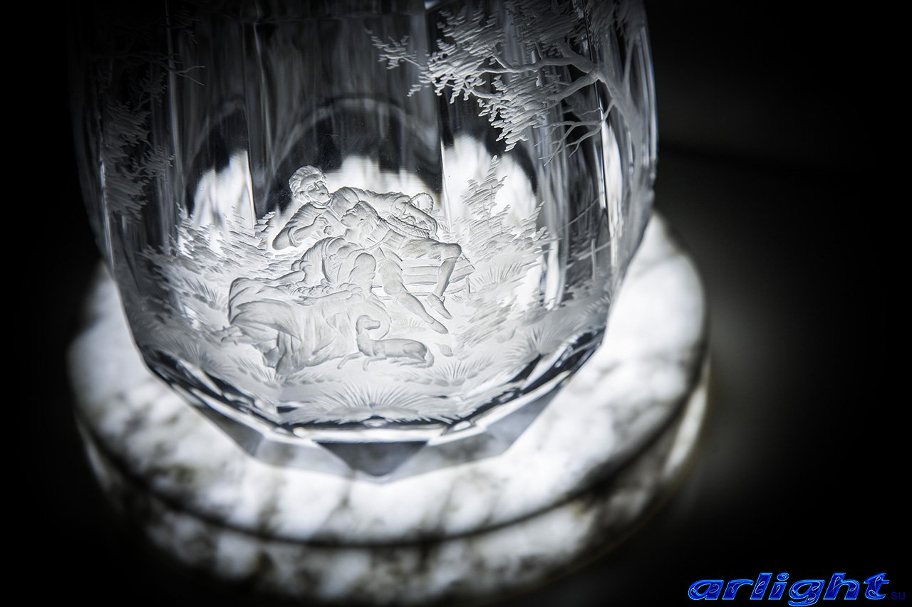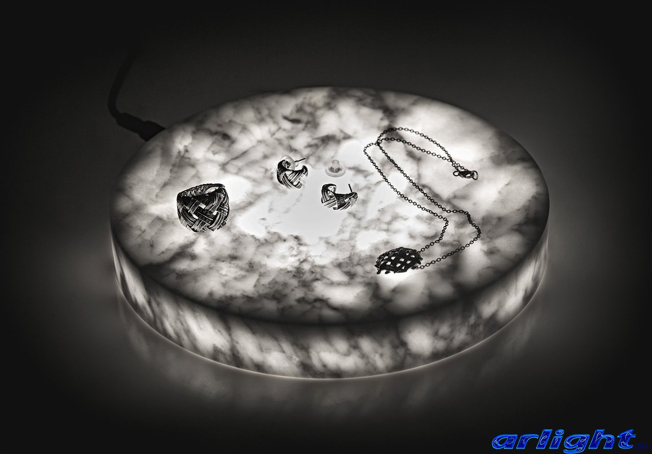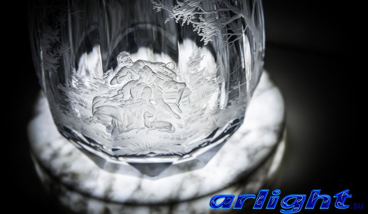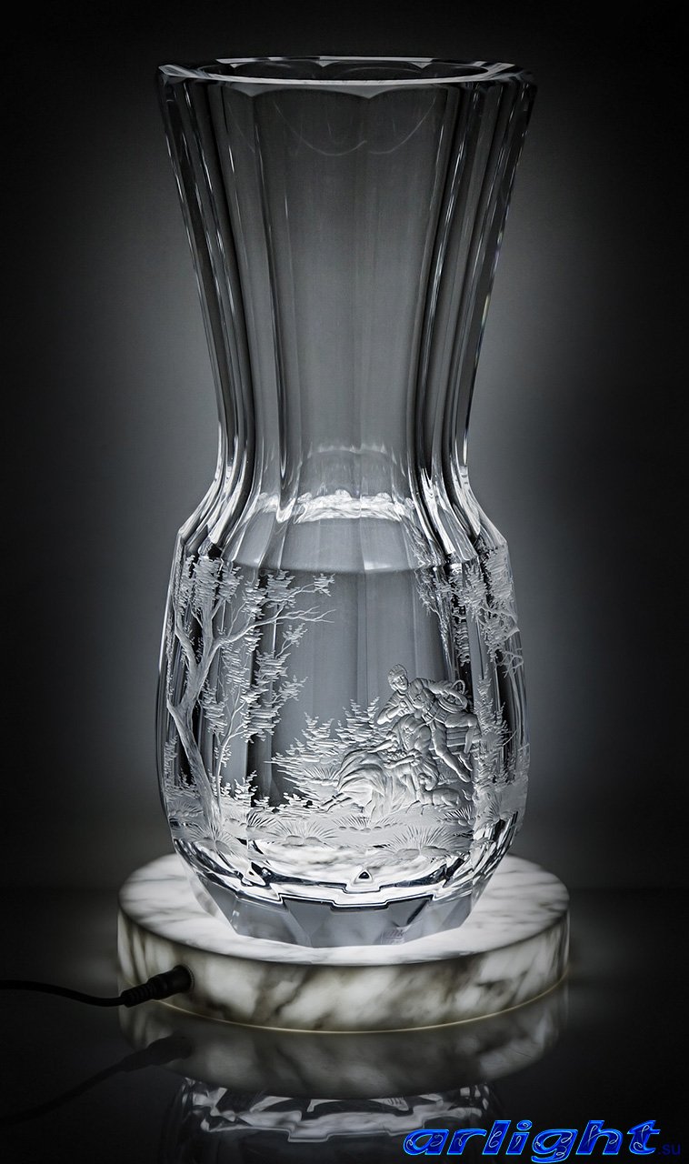Светящийся изнутри мрамор и сам по себе смотрится очень эффектно, а яркость светодиодов позволяет подсветить не только сам пьедестал, но и стоящие на нём объекты. Особенно интересно смотрится хрустальная ваза, в чём можно убедиться, взглянув на фото.