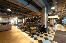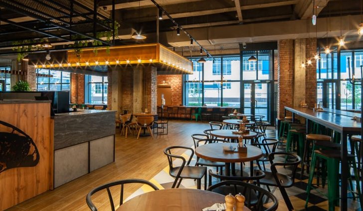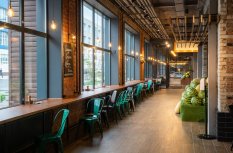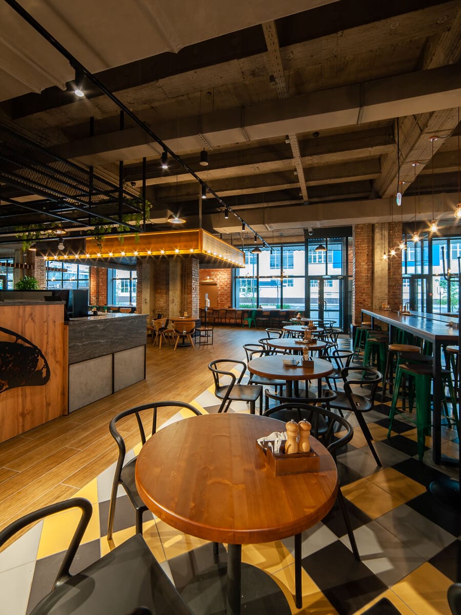 Дизайн интерьера, выполненный в индустриальном стиле, довольно привычное, но не теряющее своей актуальности решение для подобных пространств. В связи с обилием открытых коммуникаций под потолком, в проекте используются в основном подвесные решения, довольно большая часть которых приходится на трековые системы Arlight.