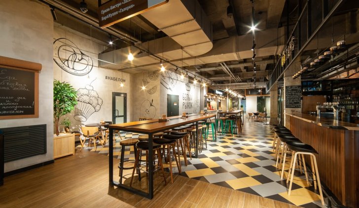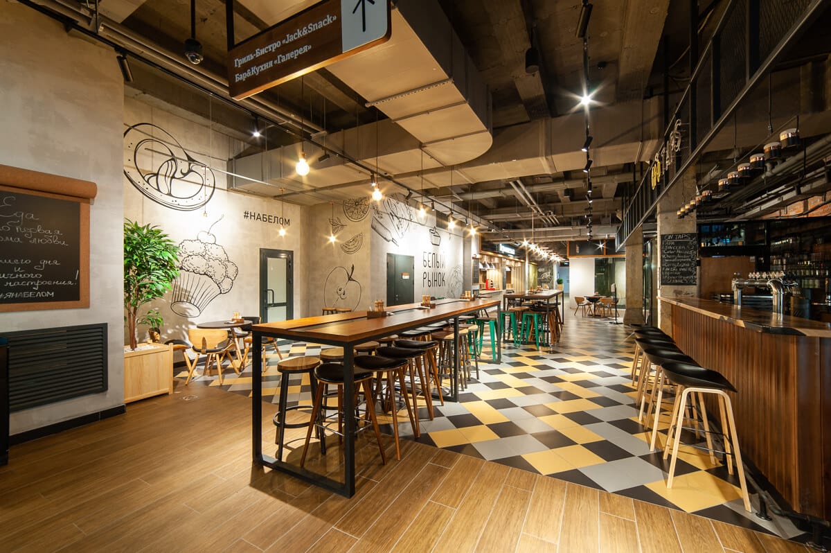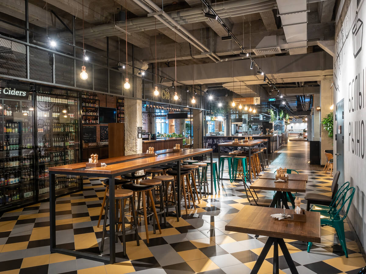 «Белый рынок» — это фуд-маркет, в котором владельцы стремились совместить торговые ряды, множество точек с разнообразными кухнями и гастрономическими экспериментами, а также площадку для проведения культурных мероприятий.