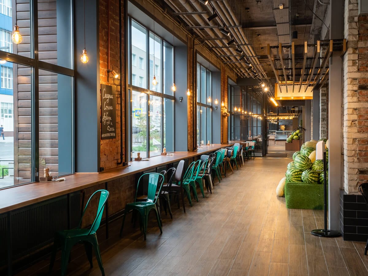 Источниками освещения служат 220 трековых светильников, чья конструкция позволяет вращать их на 350° — отличное решение, когда необходимо легко и просто изменить световые акценты. Также особенностью выбранных светильников является их высокий индекс цветопередачи CRI90, что позволяет продуктам питания выглядеть максимально привлекательно в условиях искусственного освещения.