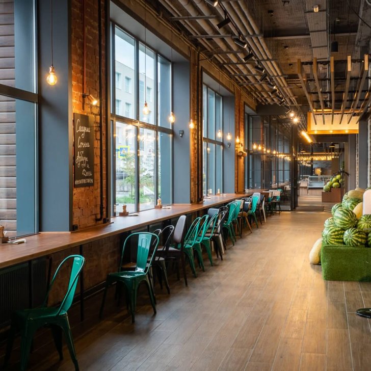 Источниками освещения служат 220 трековых светильников, чья конструкция позволяет вращать их на 350° — отличное решение, когда необходимо легко и просто изменить световые акценты. Также особенностью выбранных светильников является их высокий индекс цветопередачи CRI90, что позволяет продуктам питания выглядеть максимально привлекательно в условиях искусственного освещения.
