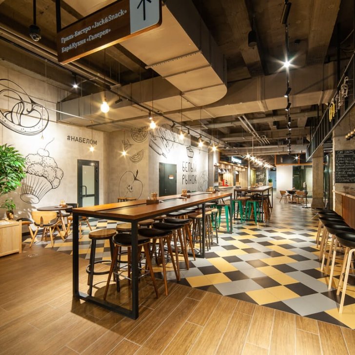 «Белый рынок» — это фуд-маркет, в котором владельцы стремились совместить торговые ряды, множество точек с разнообразными кухнями и гастрономическими экспериментами, а также площадку для проведения культурных мероприятий.