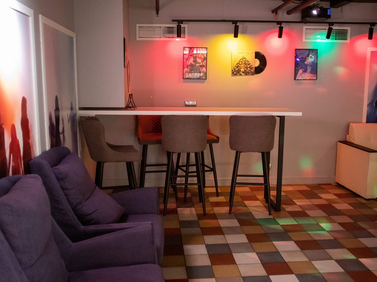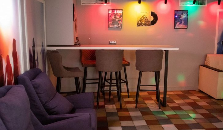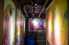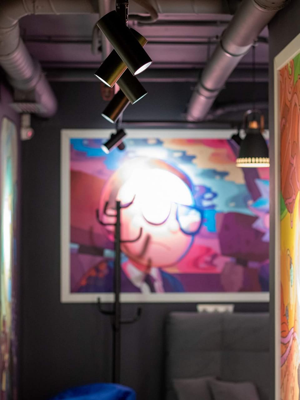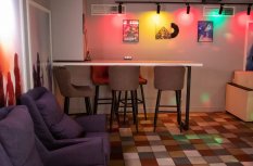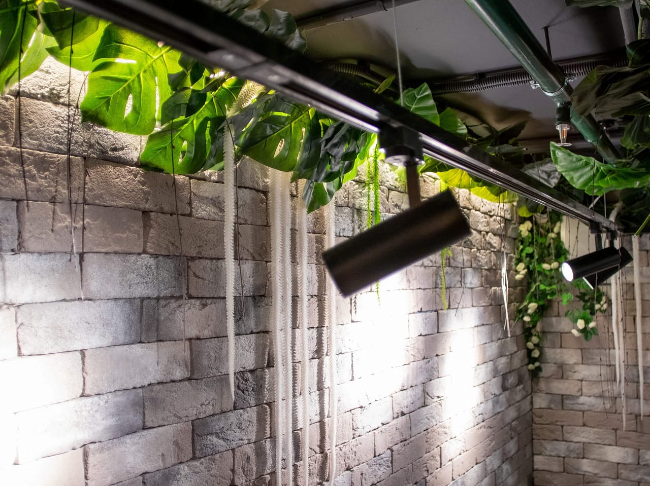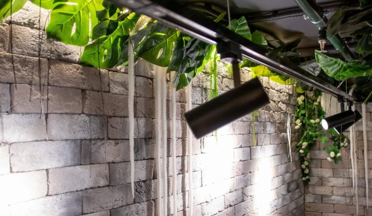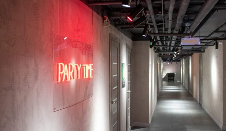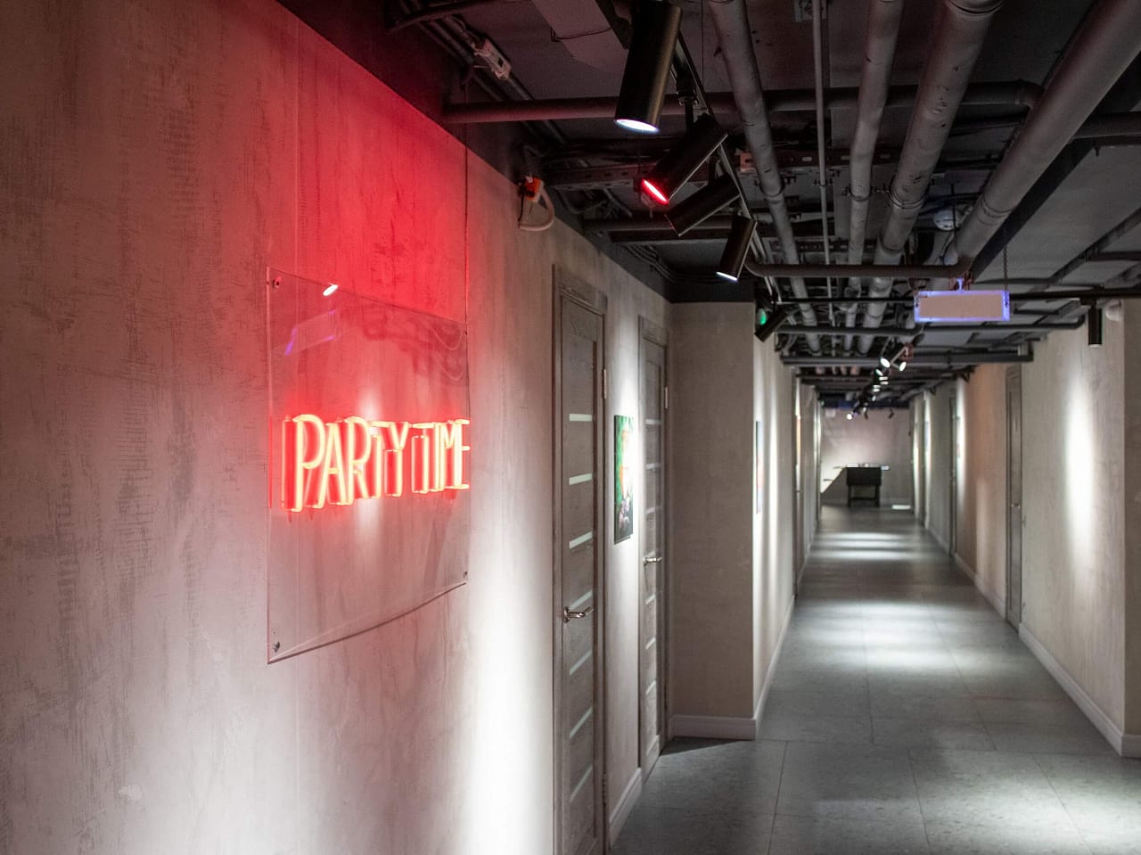 Для освещения креативного пространства Party time, выполненного в стиле лофт с яркими акцентами, использовалось универсальное решение – трековые светильники. На фоне тёмных потолков чёрные треки не особо выделяются, их задача дать качественный свет и дополнить интерьер, а не солировать.