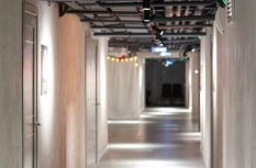 Благодаря простому и лаконичному дизайну светильников, они отлично вписались в разные локации пространства. Светильники в форме бочонков визуально перекликаются с трубами коммуникаций, на потолке, которые было решено оставить открытыми.