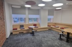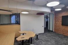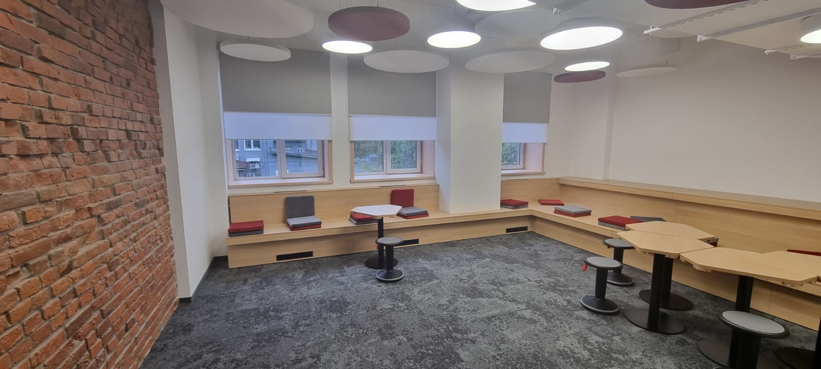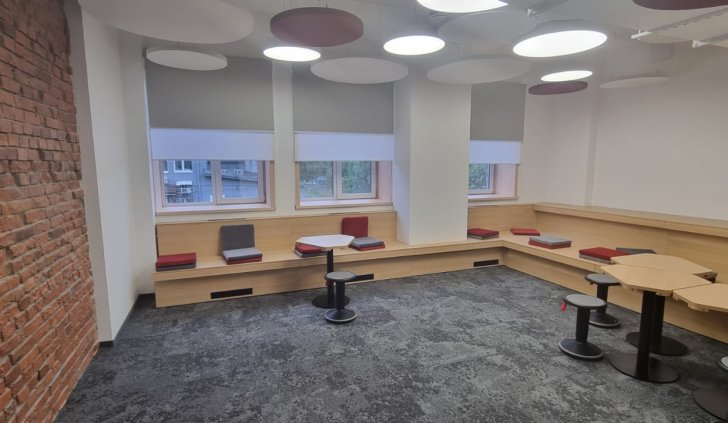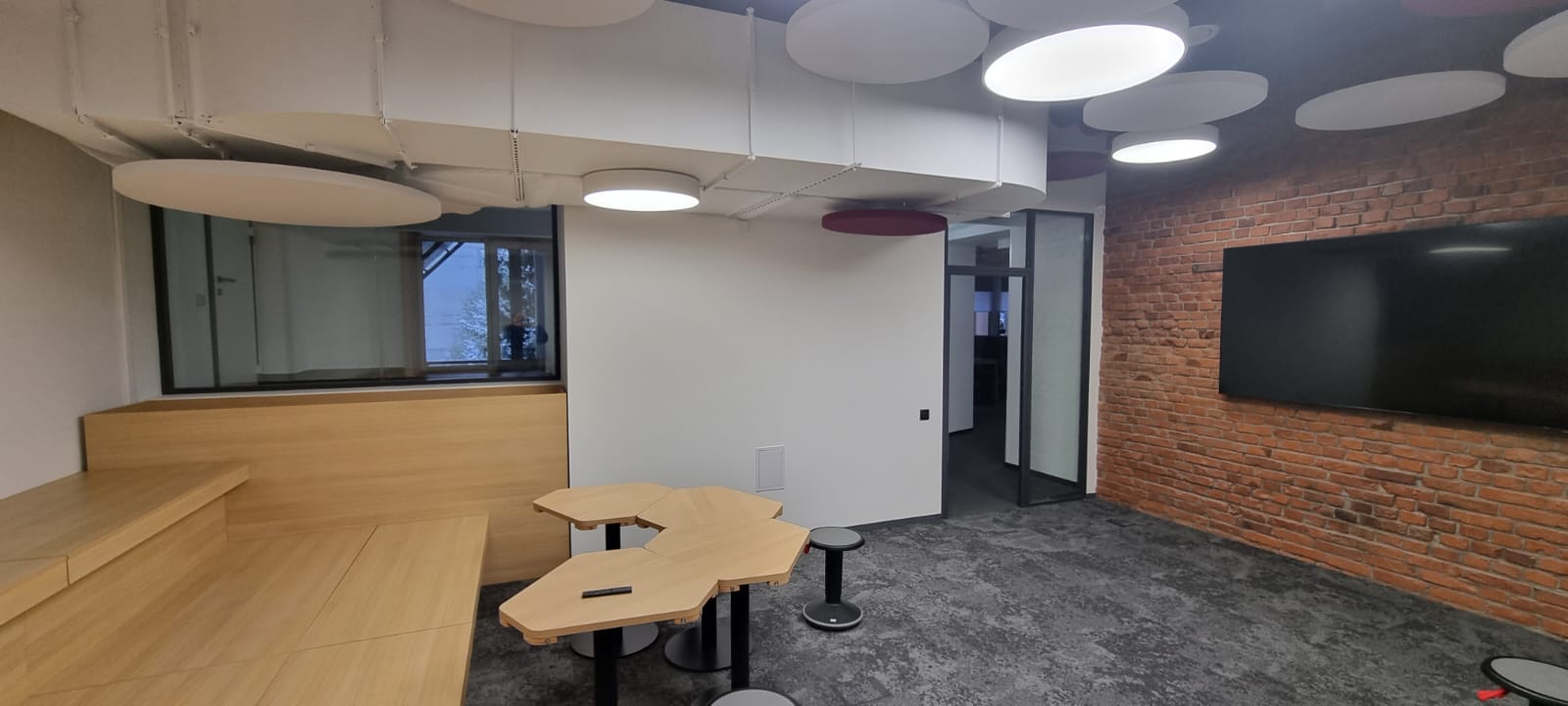 В переговорной комнате сотрудники могут получать вдохновение прямо с потолка! Комбинация круглых светильников различных диаметров с декоративными элементами создает в этой комнате легкую и непринужденную атмосферу.