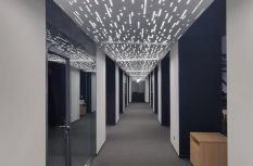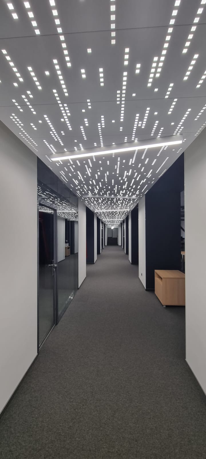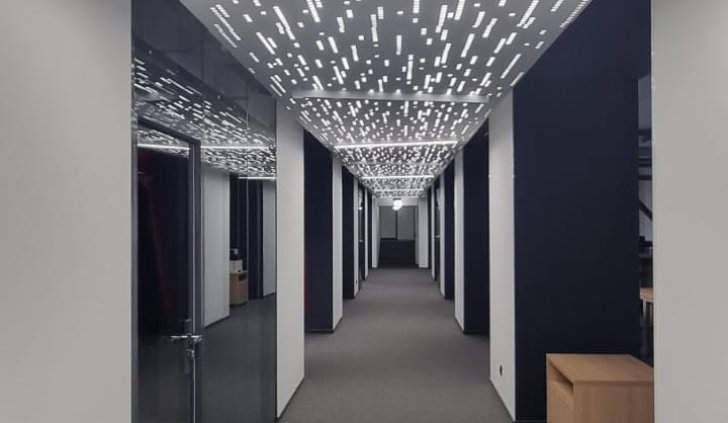 Особенно впечатляющим является потолок в коридоре, где светящиеся элементы напоминают кодовую строку. Несмотря на его оригинальность, это решение недостаточно для общего освещения, поэтому на потолке также установлены накладные линейные светильники.