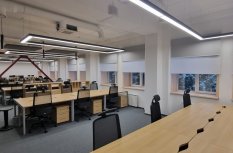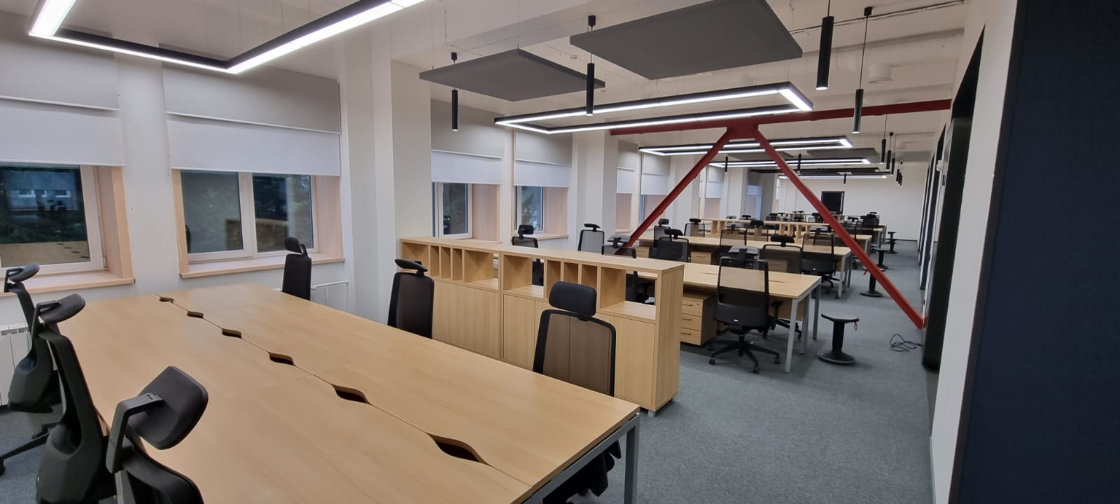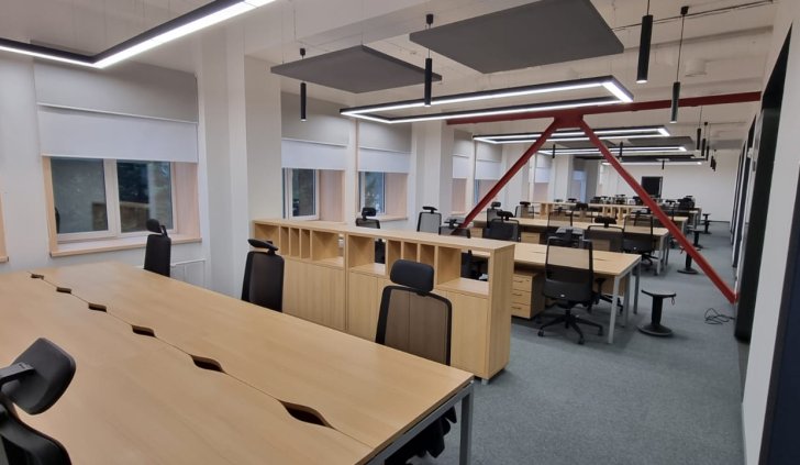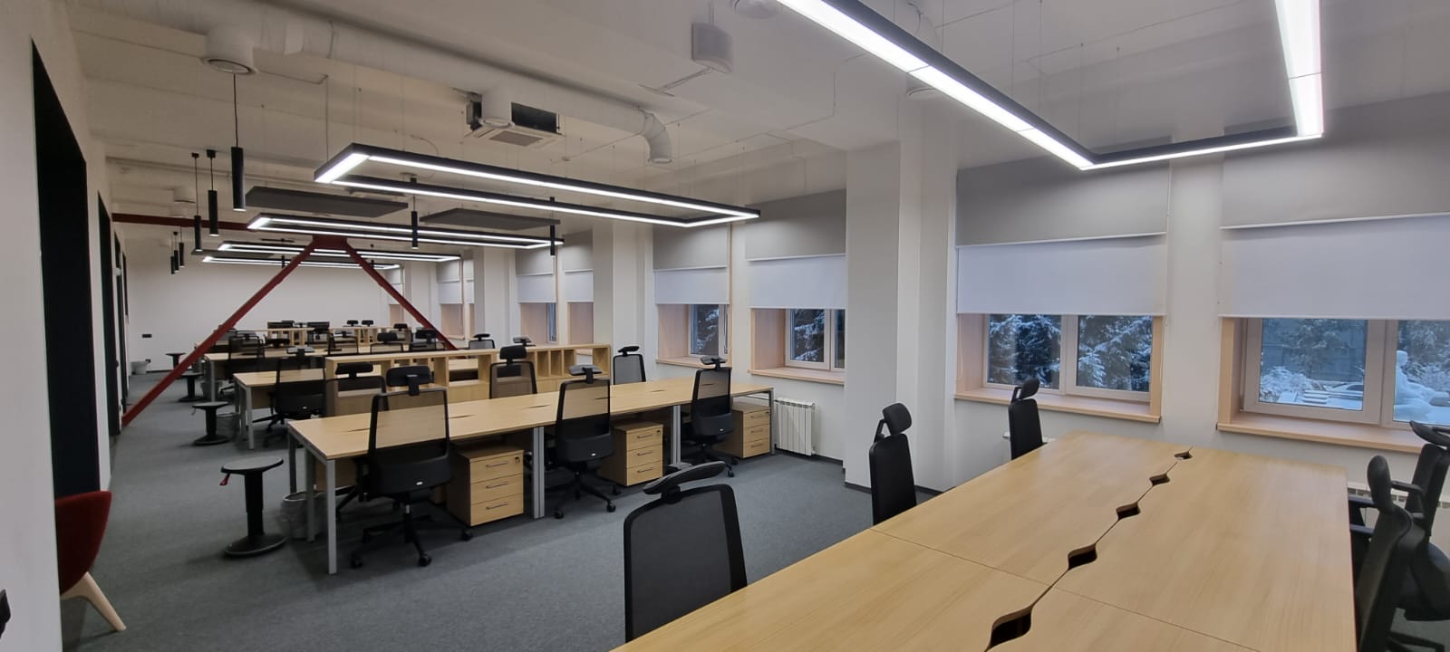 Современный стильный офис организован в формате open space. Рабочие места сотрудников освещаются прямоугольными областями световых линий, которые повторяют форму столов. Геометричность офиса подчеркивается ломаными линиями бордовых перегородок.
