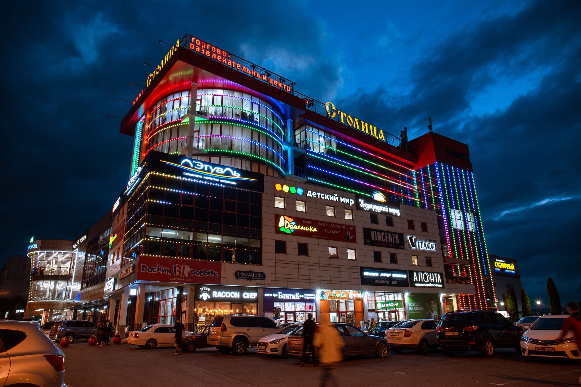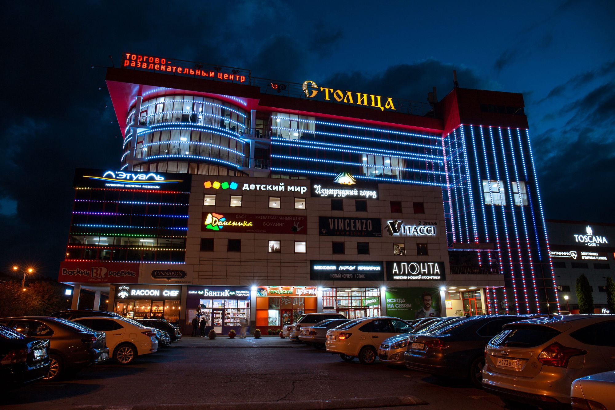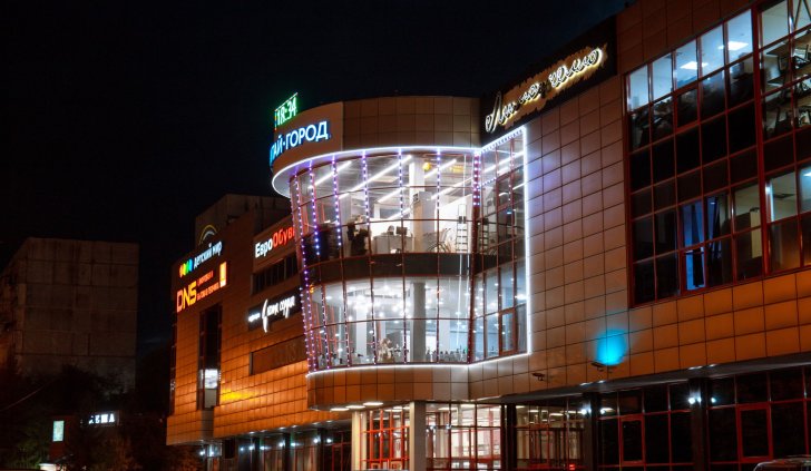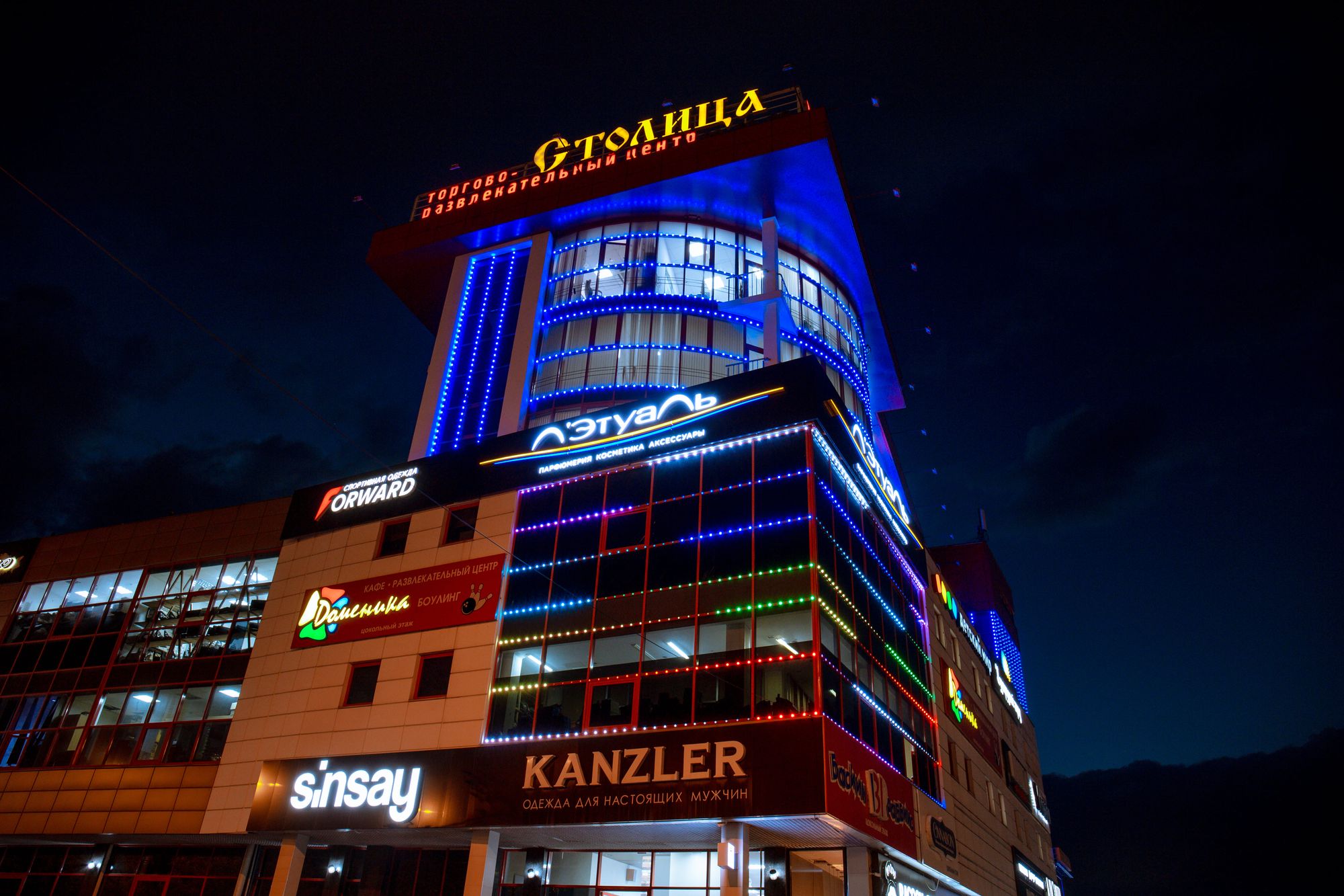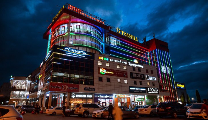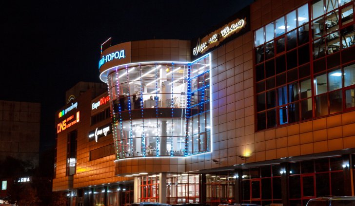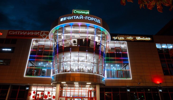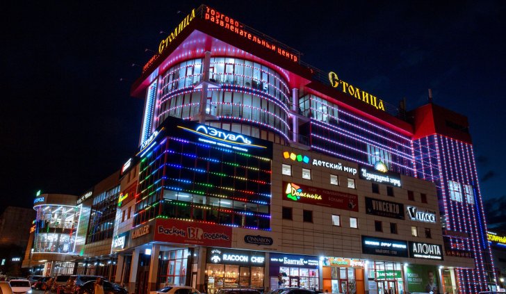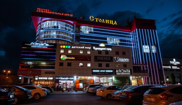 Фасад торгового комплекса "Столица" привлекает внимание даже в темное время суток благодаря использованию светодиодных модулей от Arlight. Линии глубоких и насыщенных цветов подчеркивают контуры различных элементов здания, создавая впечатляющий эффект.