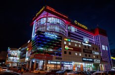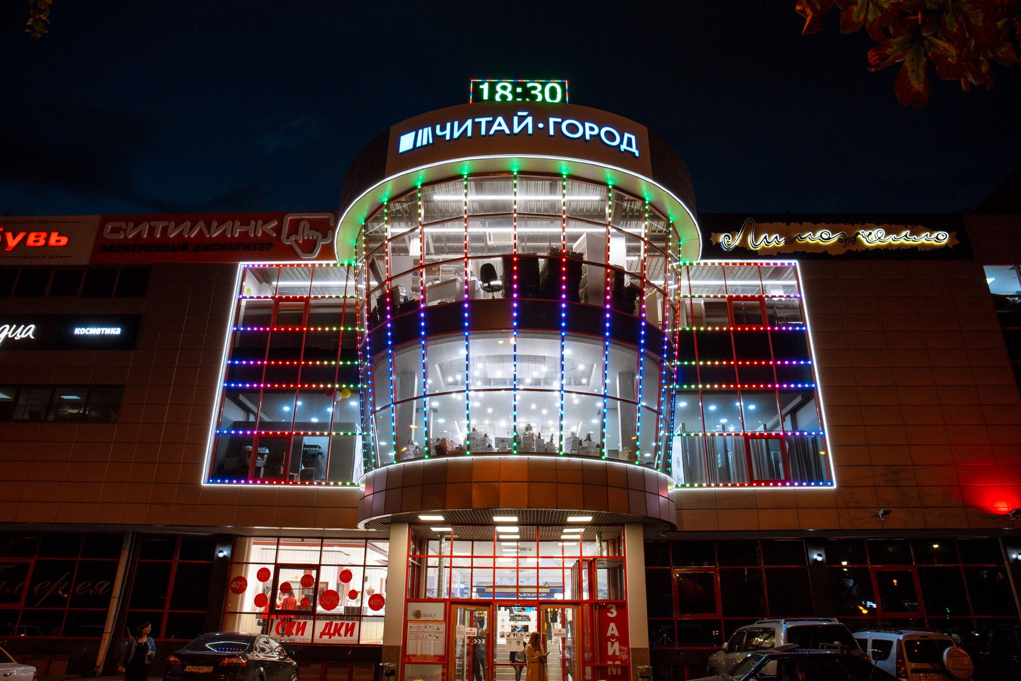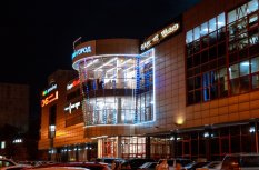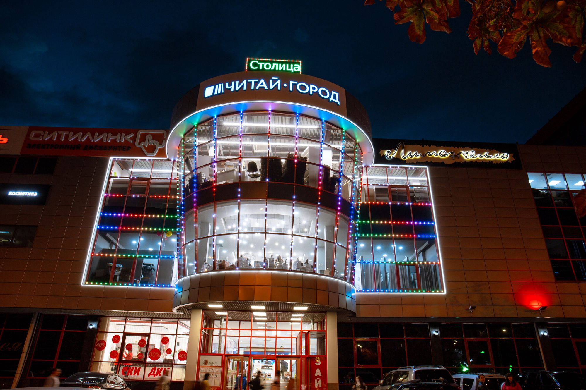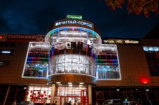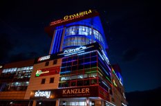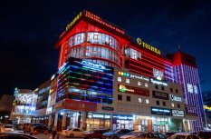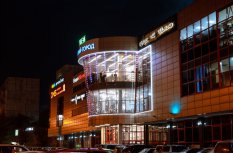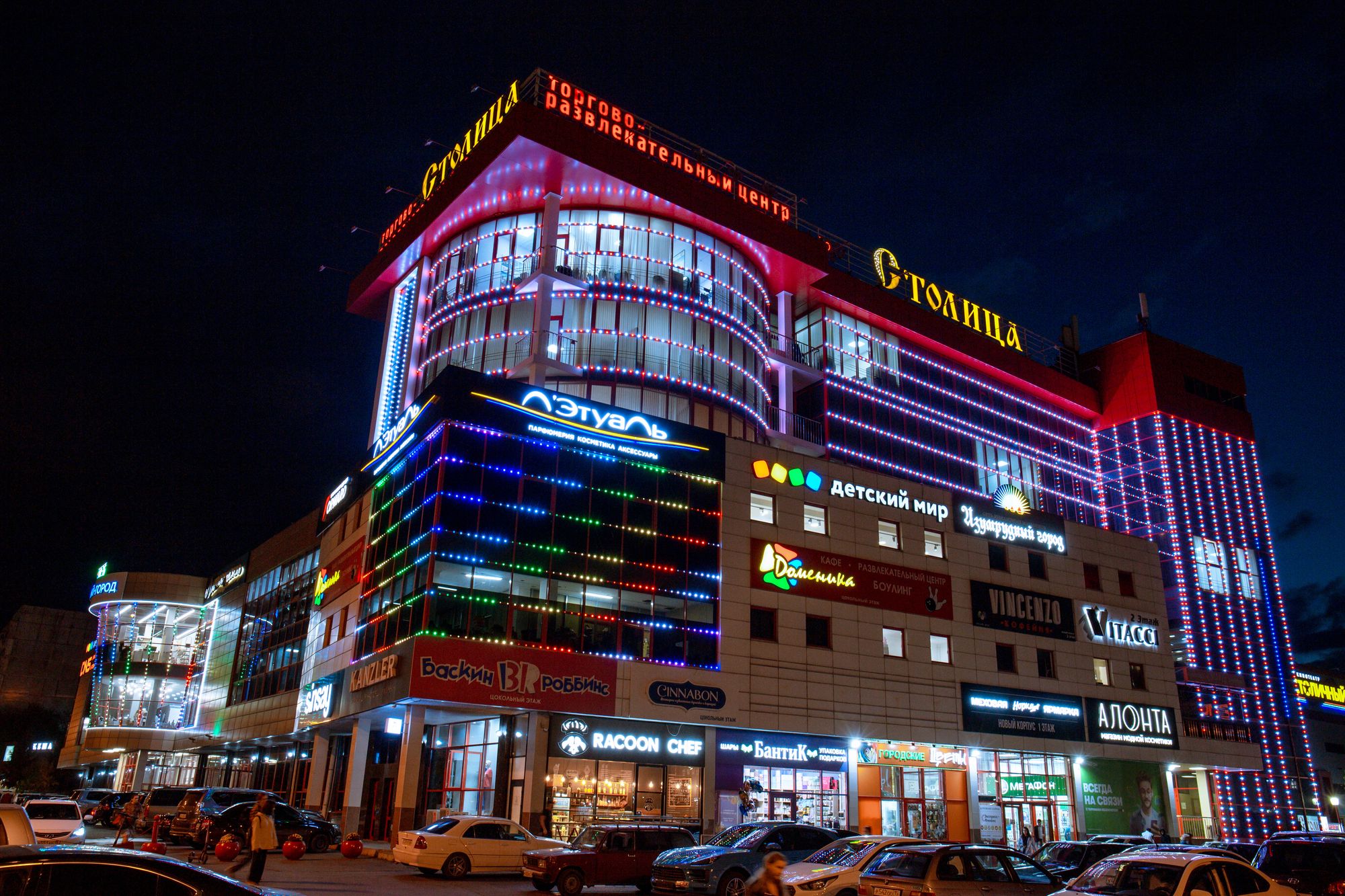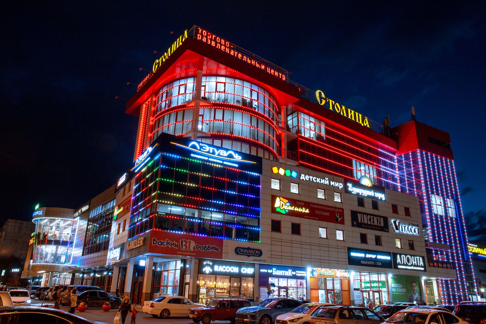 Фасад торгового комплекса "Столица" привлекает внимание даже в темное время суток благодаря использованию светодиодных модулей от Arlight. Линии глубоких и насыщенных цветов подчеркивают контуры различных элементов здания, создавая впечатляющий эффект.
