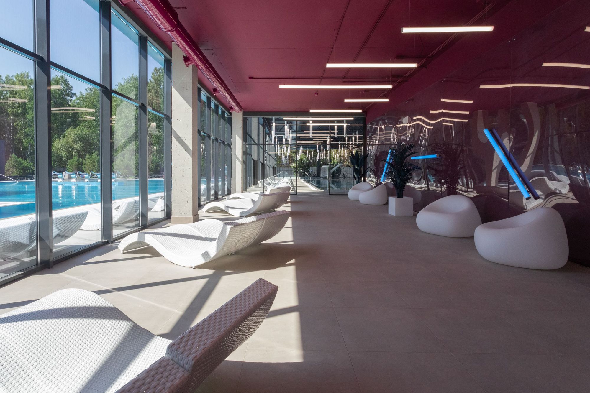 Подвесные светильники в зоне отдыха словно легко парят в невесомости, и их отражение на глянцевой поверхности стены визуально расширяет пространство. Настенные светильники-трубки с RGB-светом добавляют интерьеру ярких цветовых акцентов и оригинальности. Весь проект освещения обладает воздушной и светлой атмосферой, гармонично сочетаясь с общей концепцией, вдохновленной переливающейся на солнце прозрачной водой.