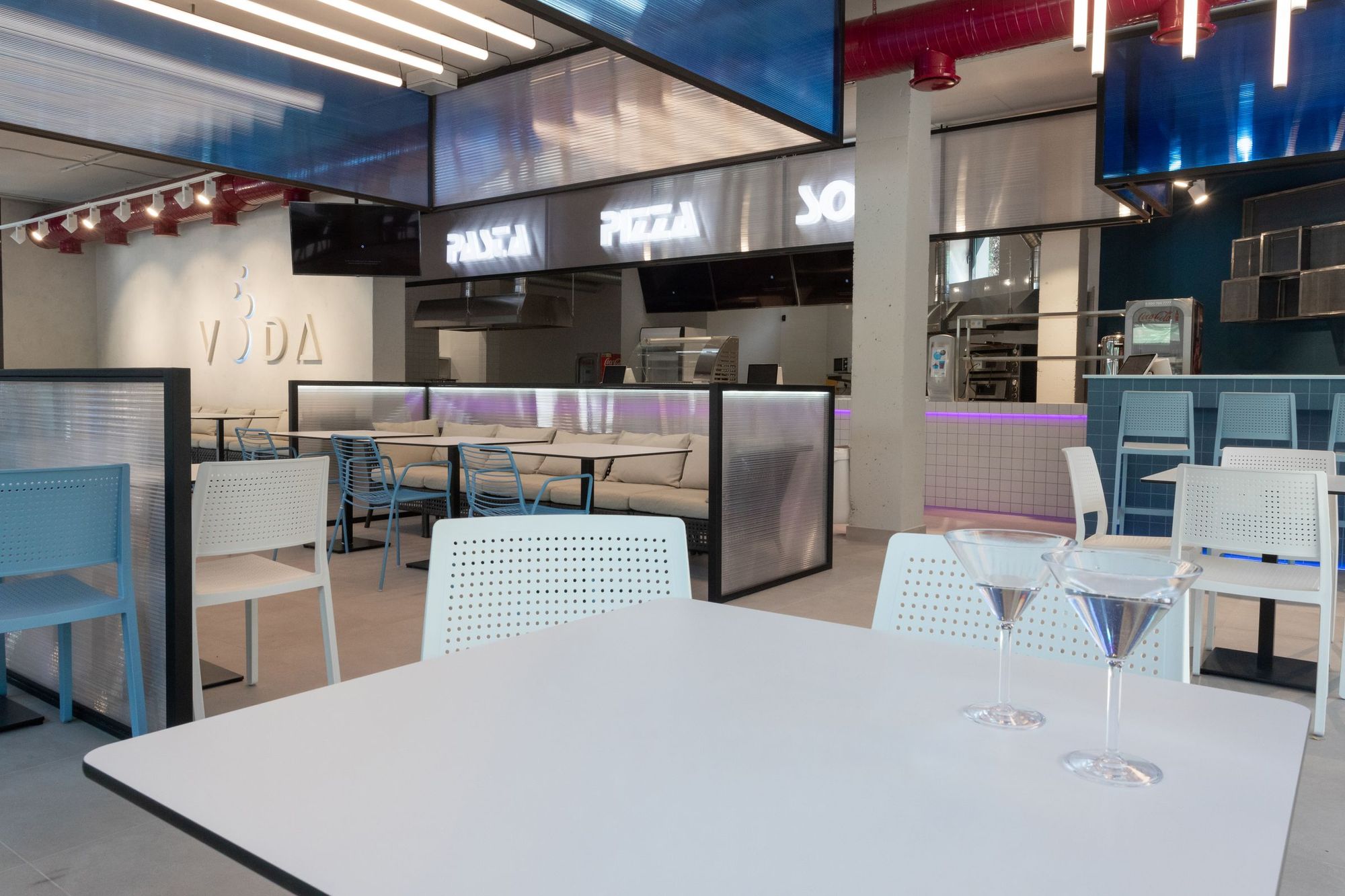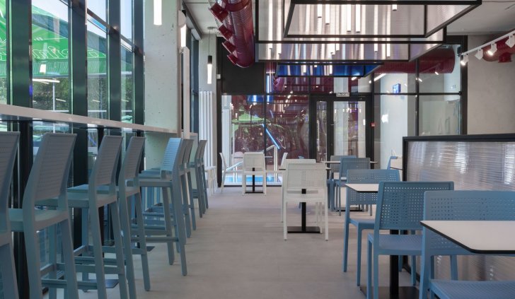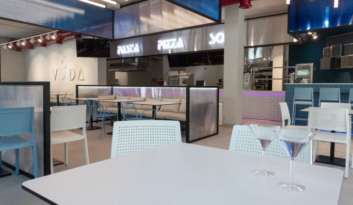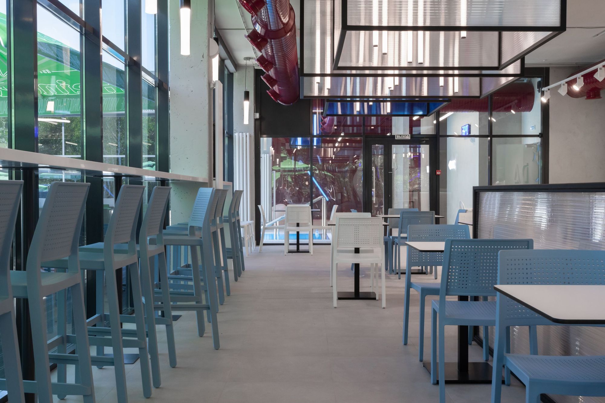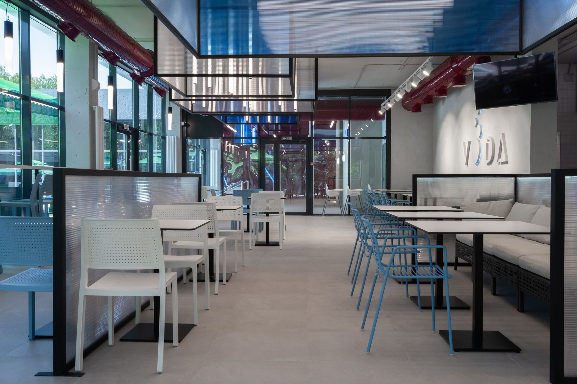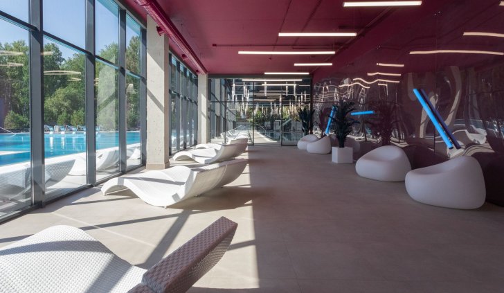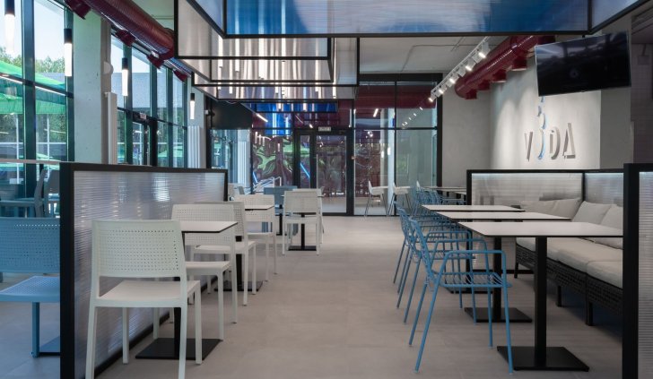 В кафе и коридорах термального комплекса VODA основным световым решением стали профильные светильники. Они обеспечивают основное освещение и прекрасно дополняют стильный интерьер. В зоне кафе были созданы оригинальные вертикальные светильники-трубки с использованием специального круглого профиля и светодиодной ленты с высоким индексом цветопередачи (CRI>95), что обеспечивает точную передачу цветов.