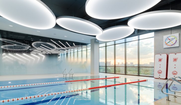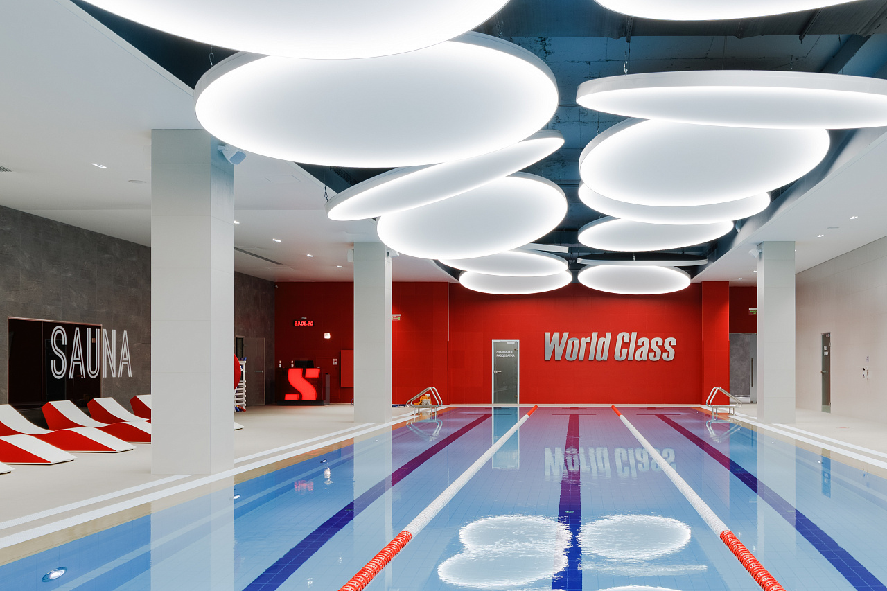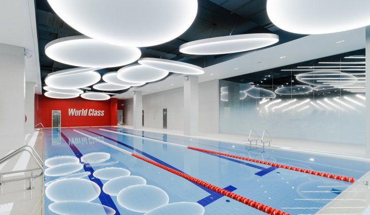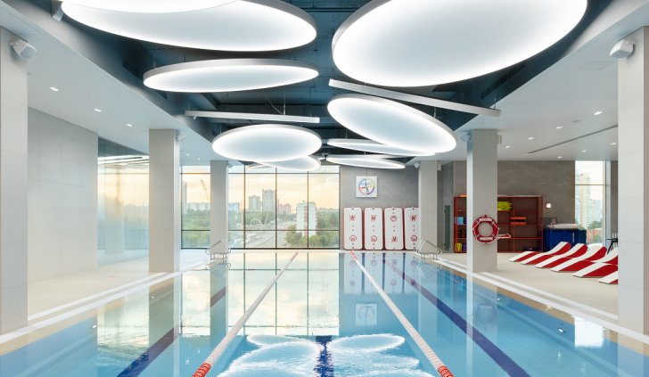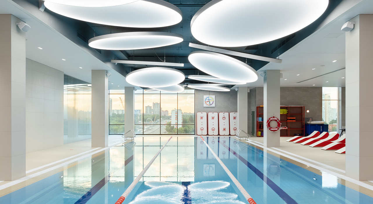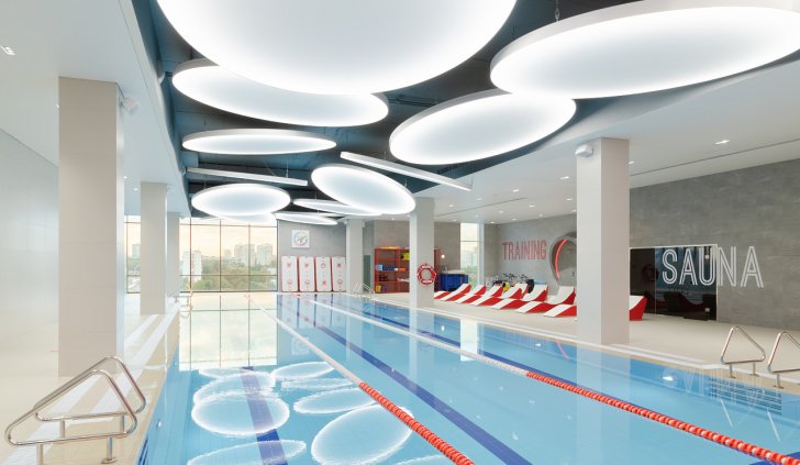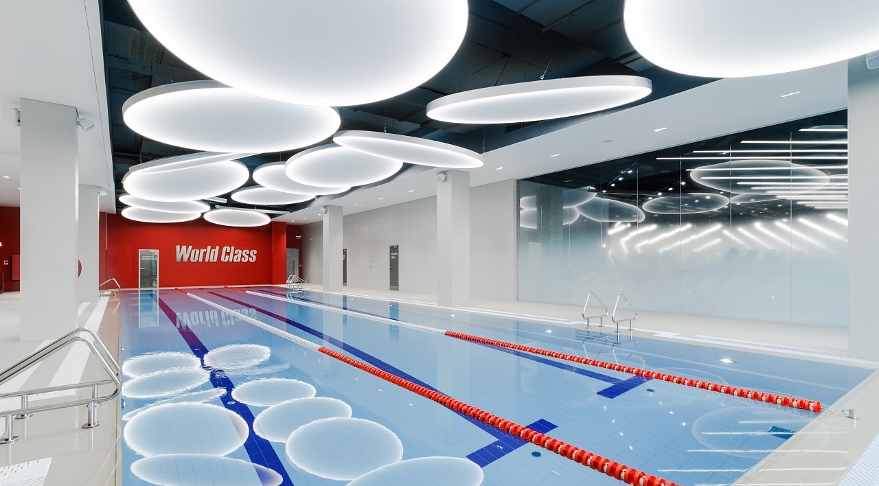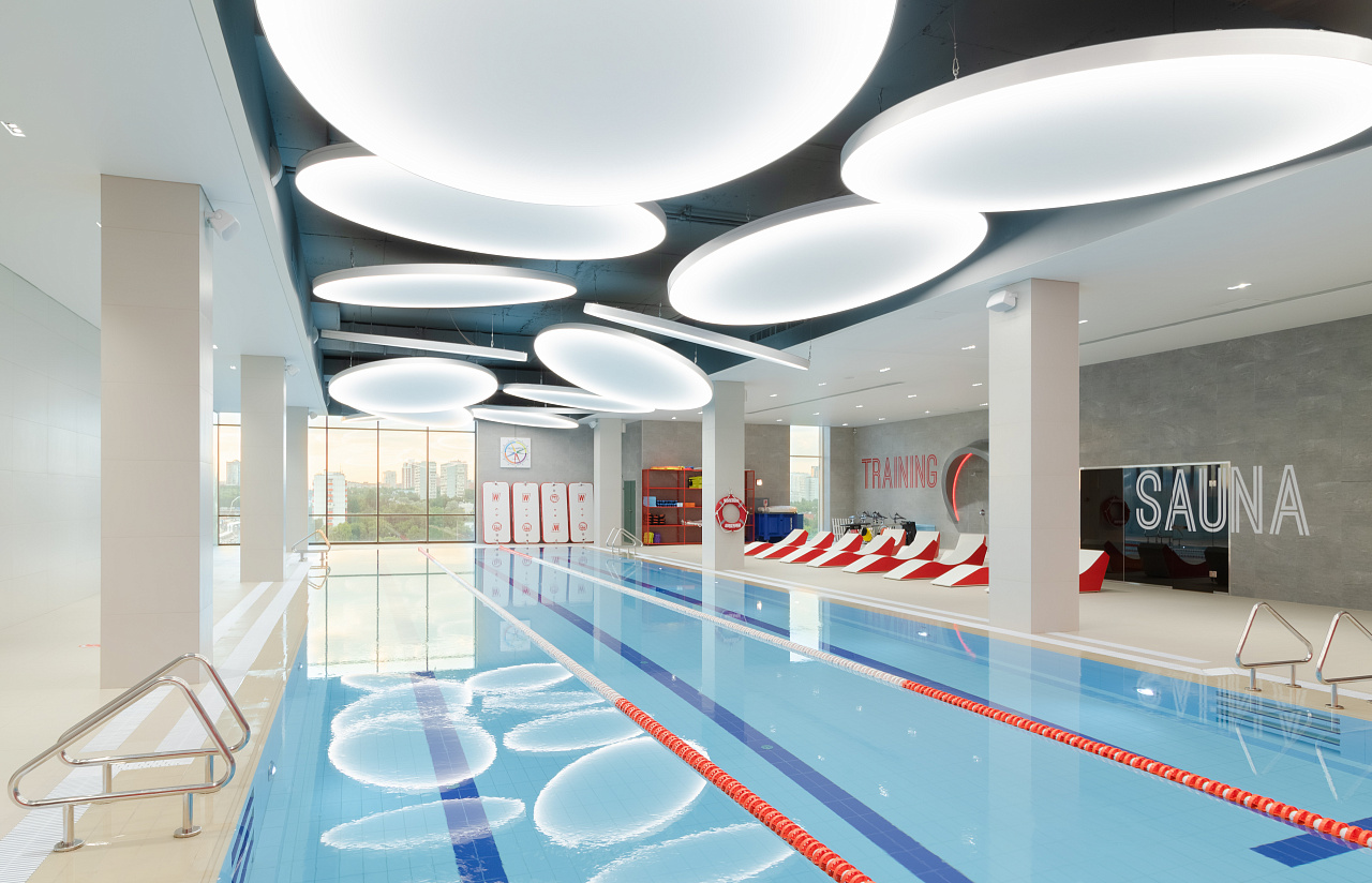 Каждая световая локация не только обеспечивает достаточную освещённость помещений, а также становится объектом для созерцания и игры в ассоциации. Огромные диски светильников над бассейном напоминают луну, иллюминаторы космического корабля или идеально ровные облака? Ломаные линии света — это летящие стрелы, разметка бегового стадиона или двери в секретную лабораторию? Светодизайнерам удалось создать удивительный мир, в котором сплелись качественный белый свет, световые иллюзии и продуманное зонирование пространства.