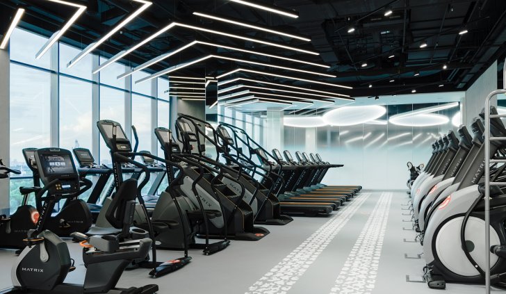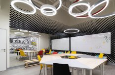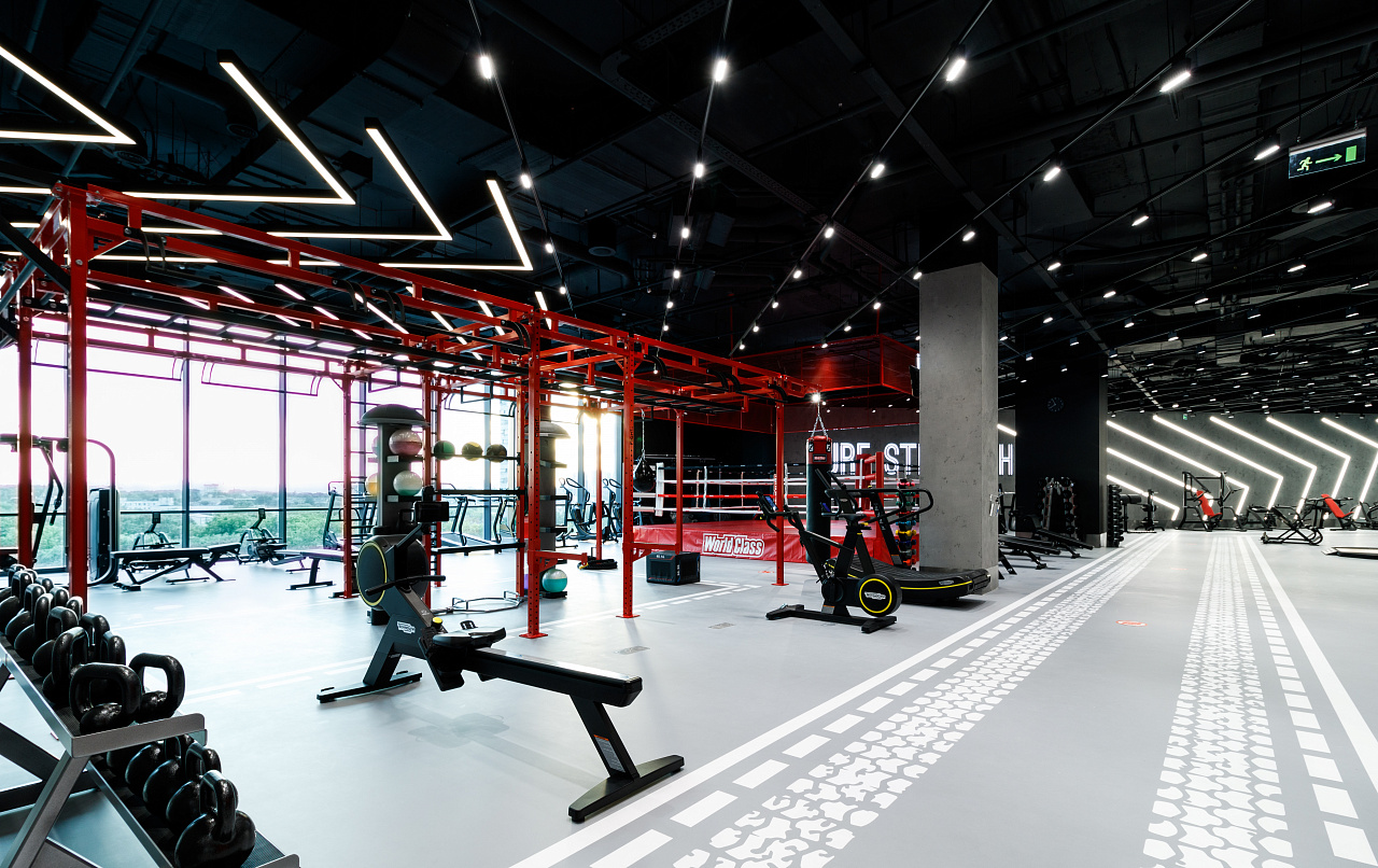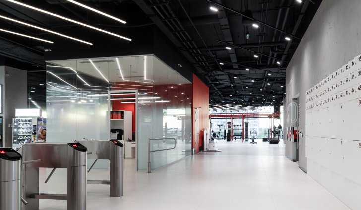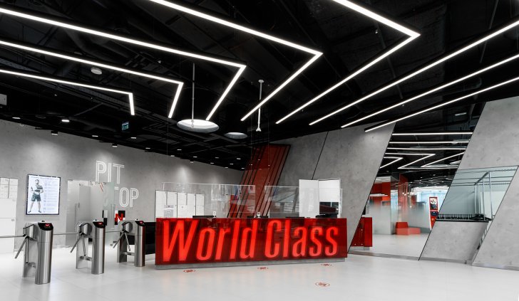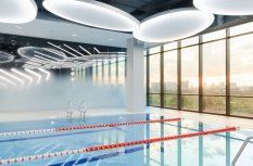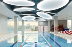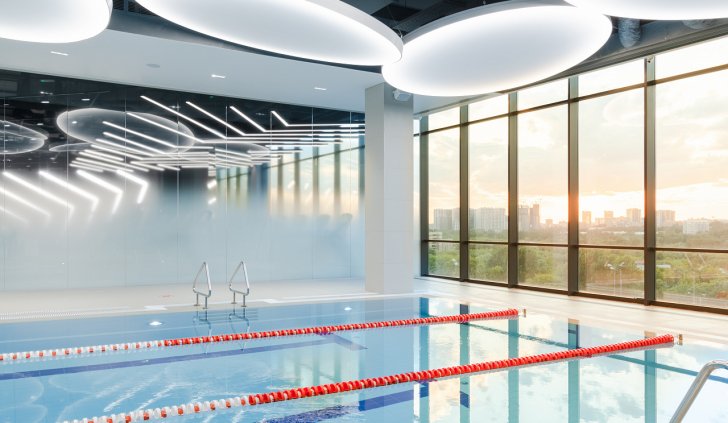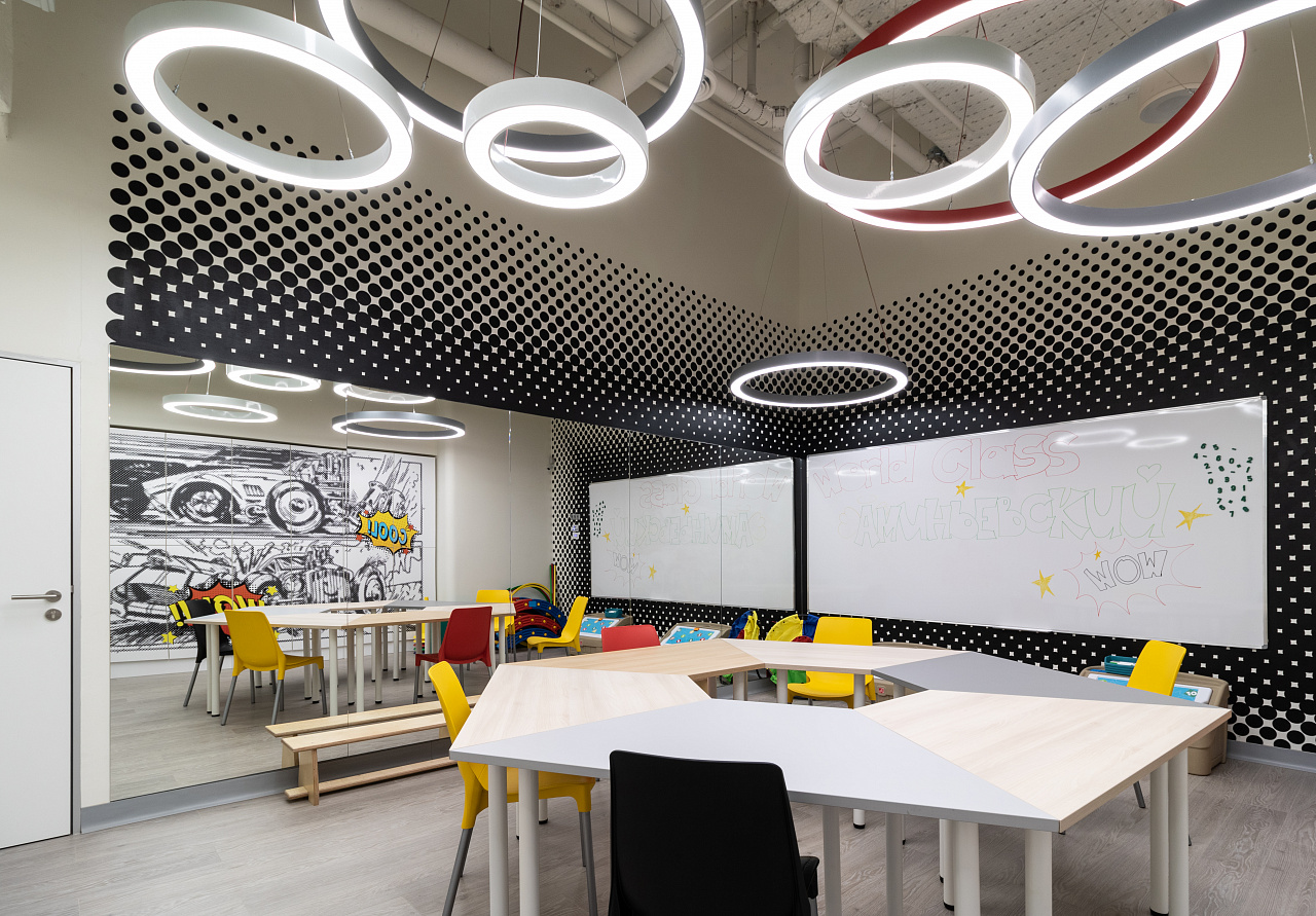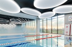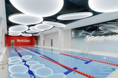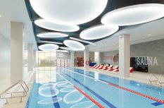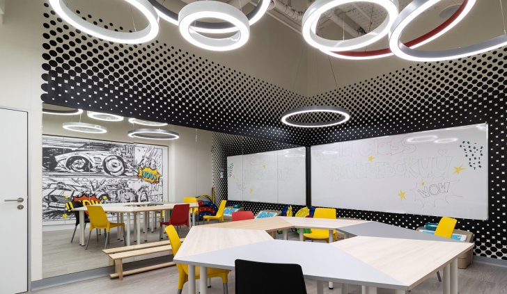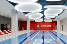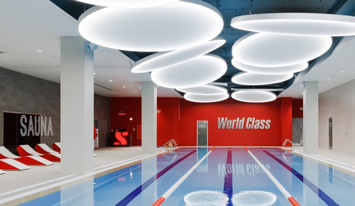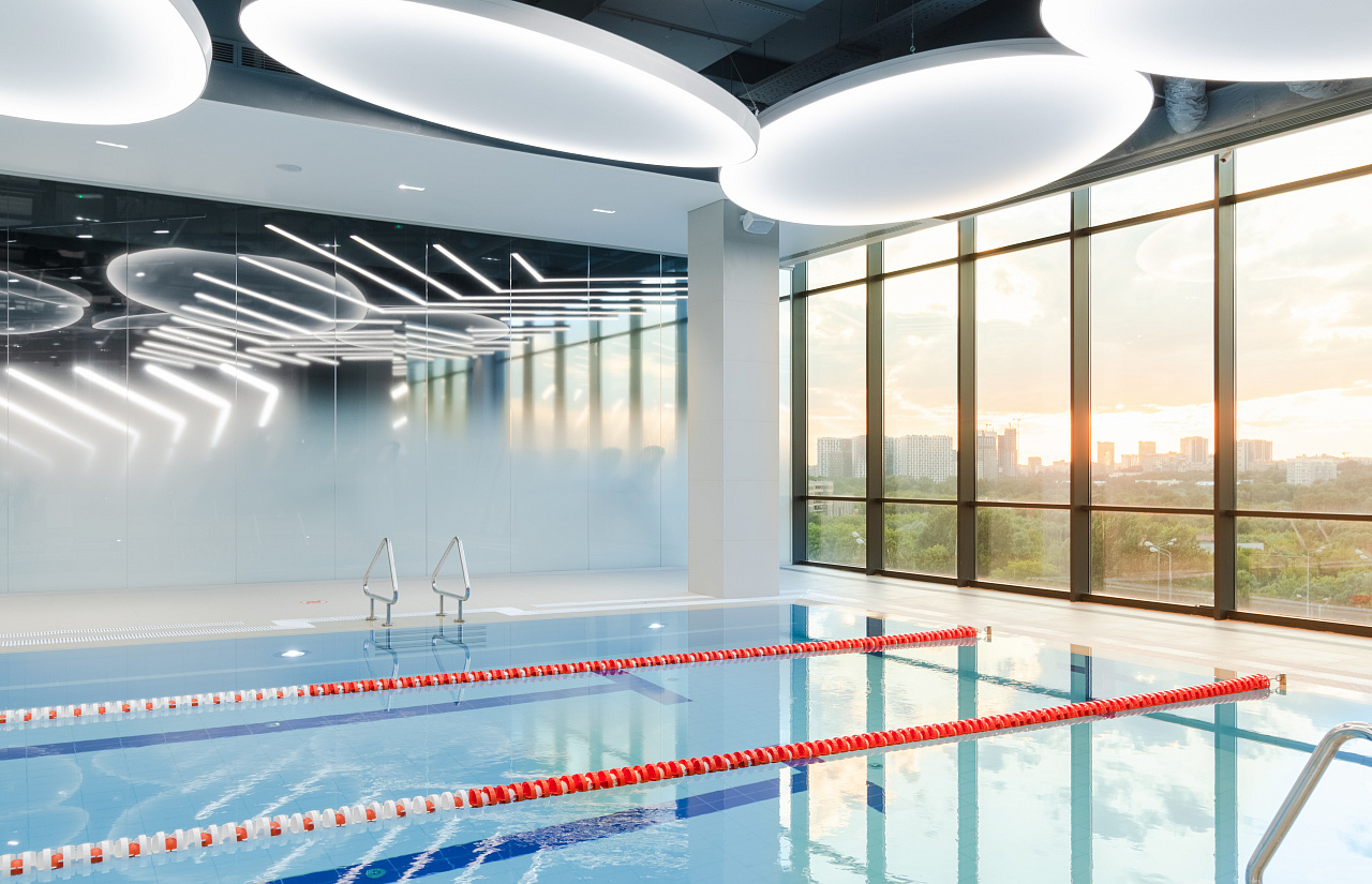 Каждая световая локация не только обеспечивает достаточную освещённость помещений, а также становится объектом для созерцания и игры в ассоциации. Огромные диски светильников над бассейном напоминают луну, иллюминаторы космического корабля или идеально ровные облака? Ломаные линии света — это летящие стрелы, разметка бегового стадиона или двери в секретную лабораторию? Светодизайнерам удалось создать удивительный мир, в котором сплелись качественный белый свет, световые иллюзии и продуманное зонирование пространства.