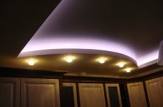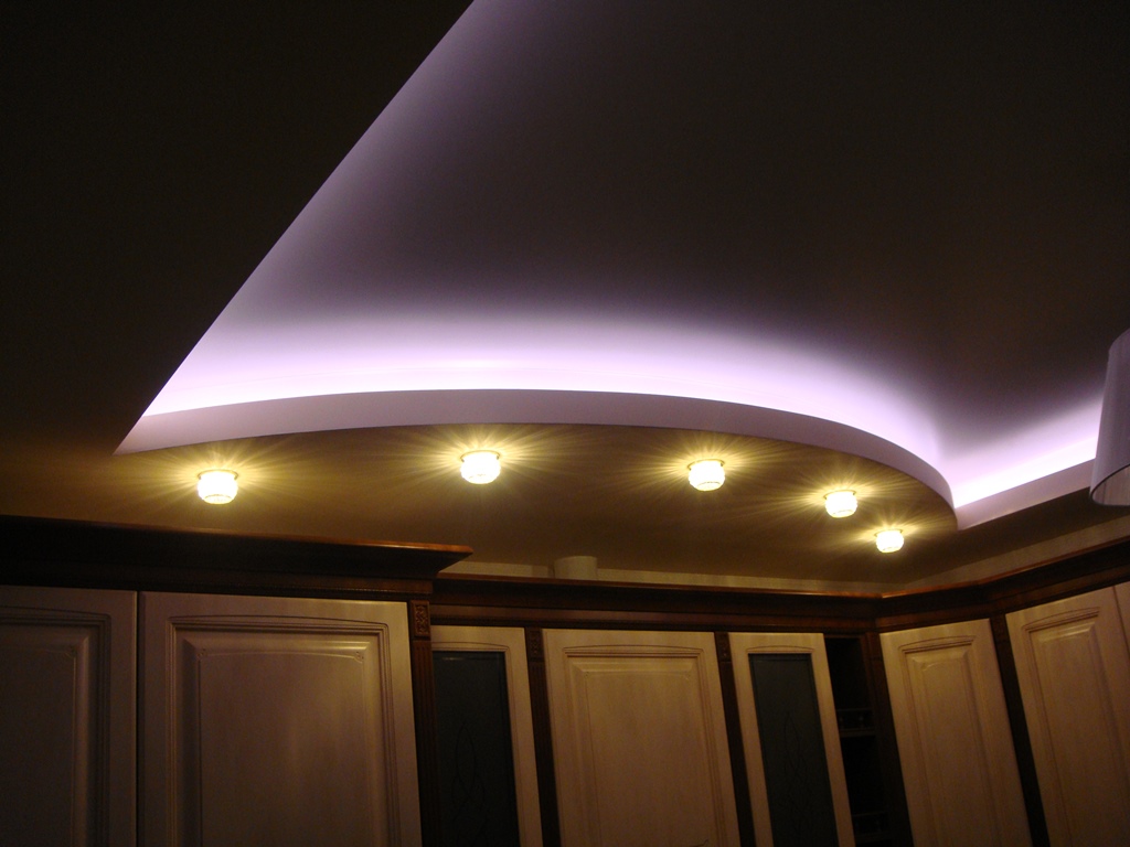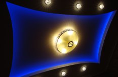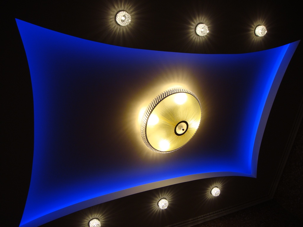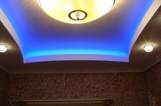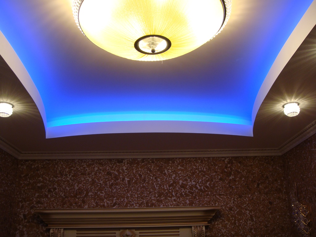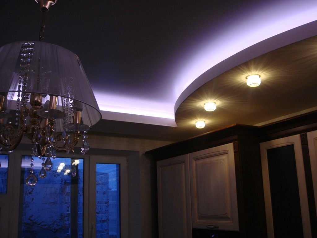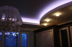 В одной из комнат на потолке сконструирована ниша прямоугольной формы со скруглёнными сторонами. По периметру за нишей установлена RGB-лента, которая в сочетании со сверкающей люстрой и точечными светильниками, создаёт праздничное настроение.