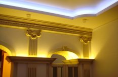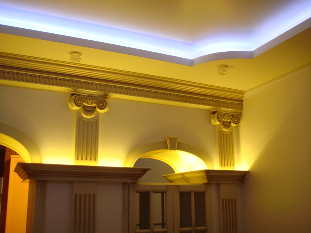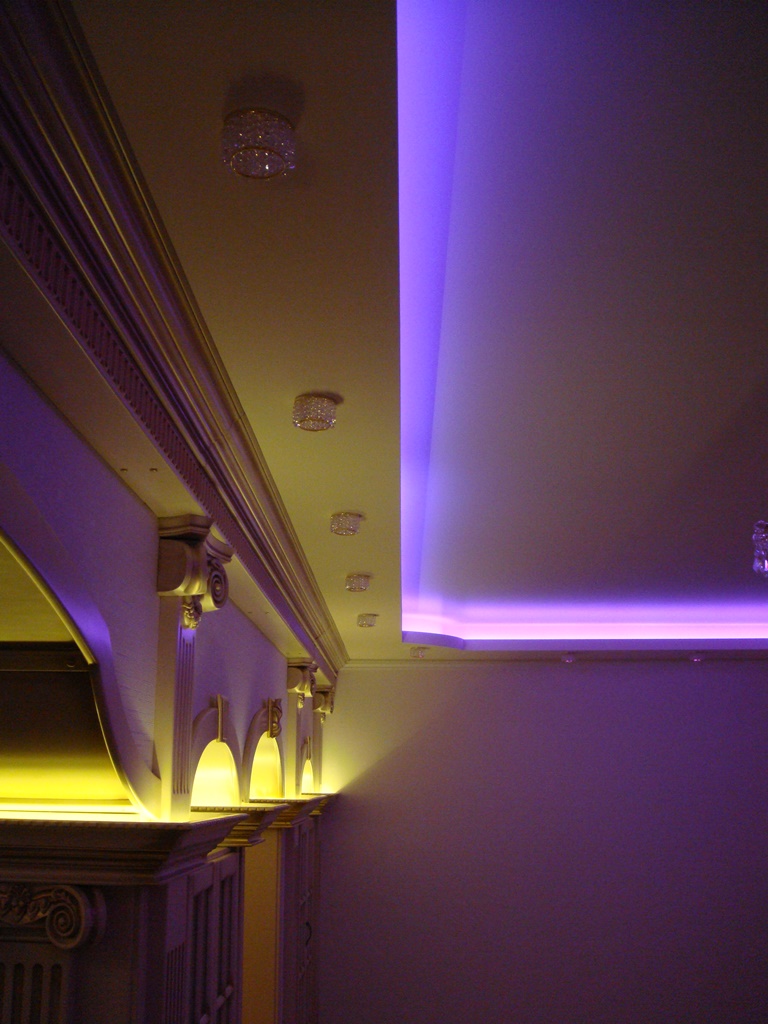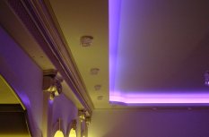 Другие помещения поддерживают общую стилистику. Там также присутствуют ниши с многоцветной светодиодной подсветкой. Верхняя часть шкафов, оформленных карнизами подсвечивается лентой с мягким тёплым свечением.