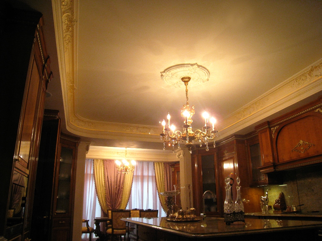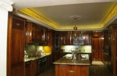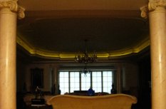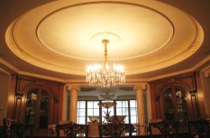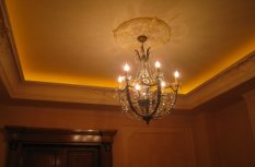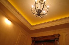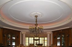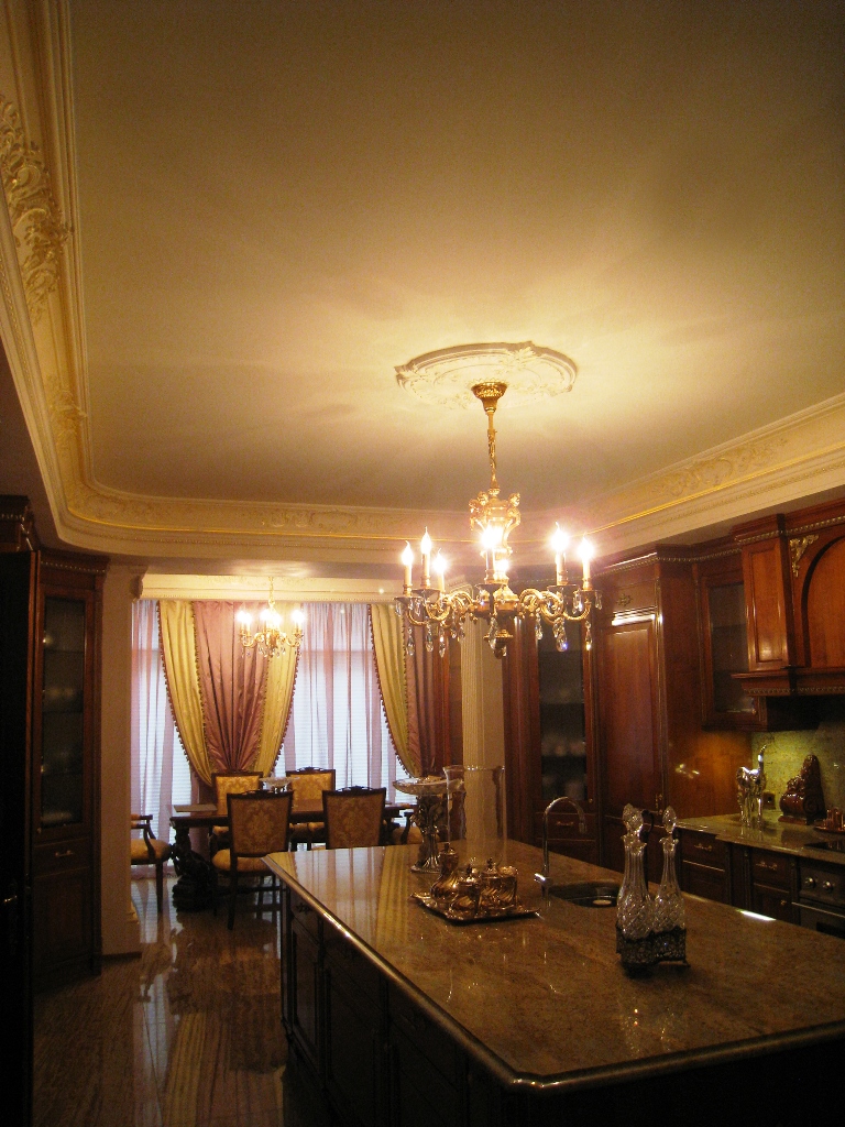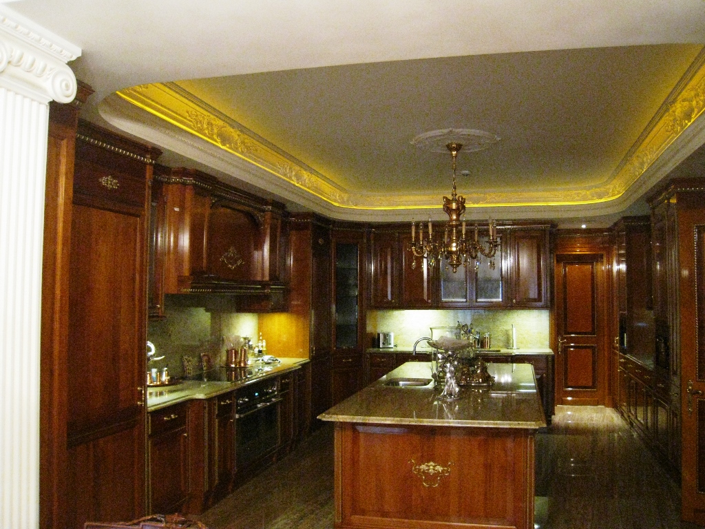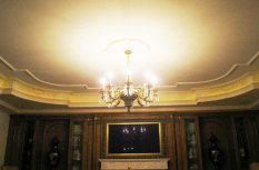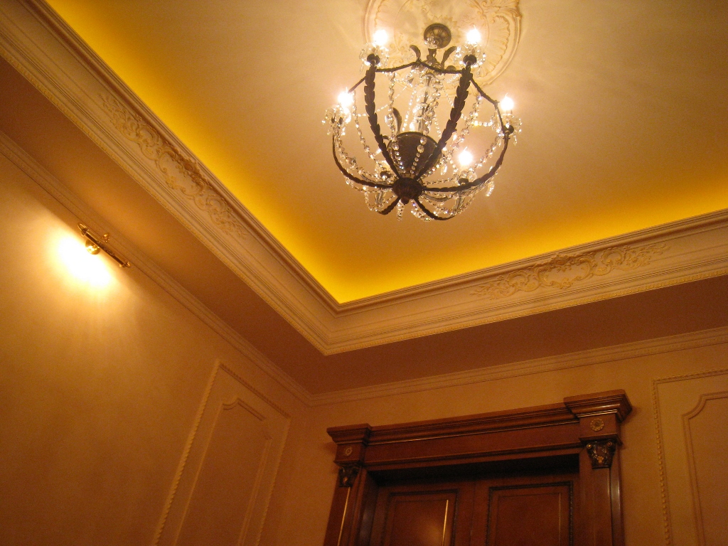 Совмещение интерьера выполненного в классическом стиле и современного светодиодного оборудования, дает интересный эффект. Массивные детали позволяют удобно расположить необходимое оборудование, а скрытая подсветка позволяет добавить легкость и объем в монументальную классику. Применение светодиодных ламп в люстрах с хрусталем дает невероятный эффект многократного отражения в гранях кристаллов. Проект выполнен с применением светодиодного оборудования торговой марки Arlight.