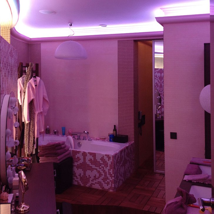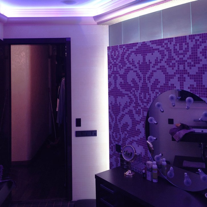 Периметр потолка ванной комнаты обрамляет декоративный карниз, в нём была установлена многоцветная светодиодная лента RGB. Двухрядная светодиодная лента RGBW, сочетающая в себе RGB светодиоды и белые светодиоды, осветила портал ванной.