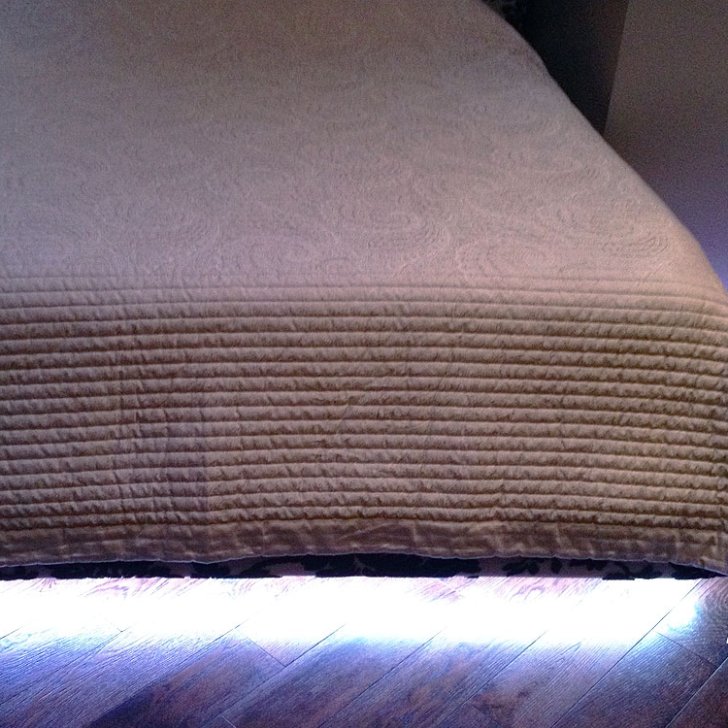В подсветке спальной комнаты так же использована RGB светодиодная лента. Она расположилась в нишах многоуровневого потолка и по периметру кровати. Светодиодная лента, установленная на каркас кровати, светит в сторону пола, такое свечение визуально приподнимает кровать и создаётся эффект, будто она парит в воздухе.