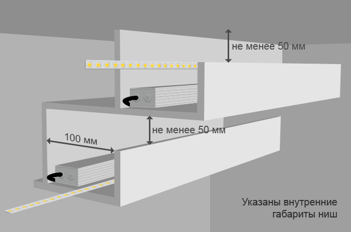 Многоуровневый карниз подсвечивается по тому же принципу, что и простой. Расположение светодиодной ленты зависит от целей, которые Вы преследуете. Если Вы наклеиваете светодиодную ленту на дно карниза, то свет, излучаемый ею, отражается от потолка, благодаря чему потолок «отрывается» и «парит» в воздухе. При этом минимальное расстояние от уровня потолка до верхней границы карниза составляет 50мм, оптимальное 70-120мм. Минимальное расстояние от стены до внутренней границы карниза составляет 100мм, оптимальное 120-150мм. Если блок питания располагается непосредственно в карнизе, то минимальная высота бортика по внутренней стороне – 50мм, оптимальная 70-100мм. Обратите внимание на то, что ниша карниза не должна быть слишком глубокой.