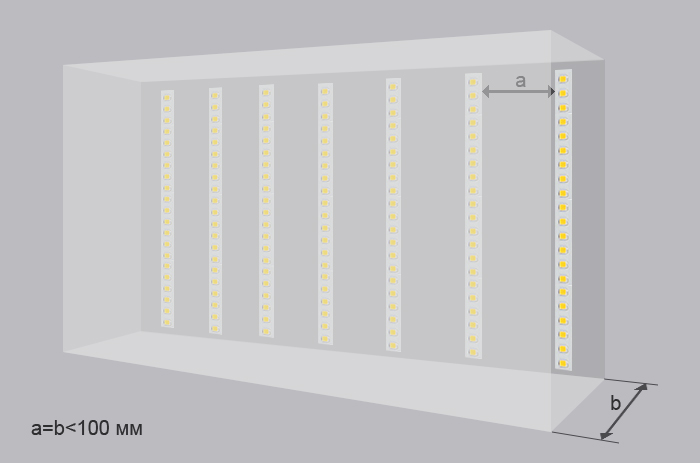 Светодиодные ленты должны быть установлены на одинаковом расстоянии друг от друга, на схеме – А. Расстояние от светодиодных лент до засвечиваемой поверхности (светопропускающих пластиковых панелей, светопропускающей баннерной ткани или других материалов), на схеме – B, должно быть равно расстоянию между лентами, т.е. A=B. Рекомендуемое расстояние – не менее 100 мм.